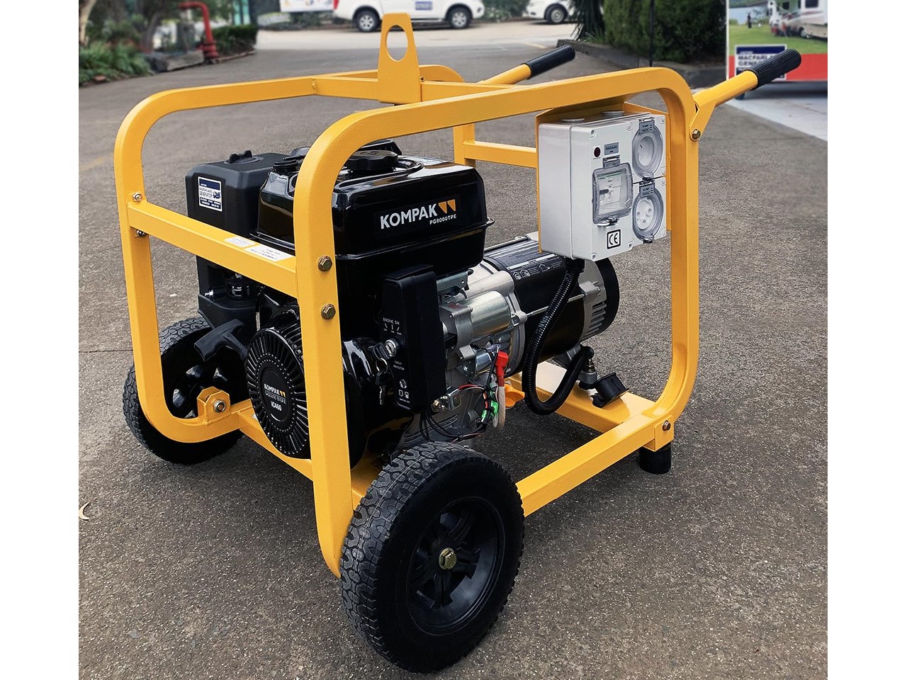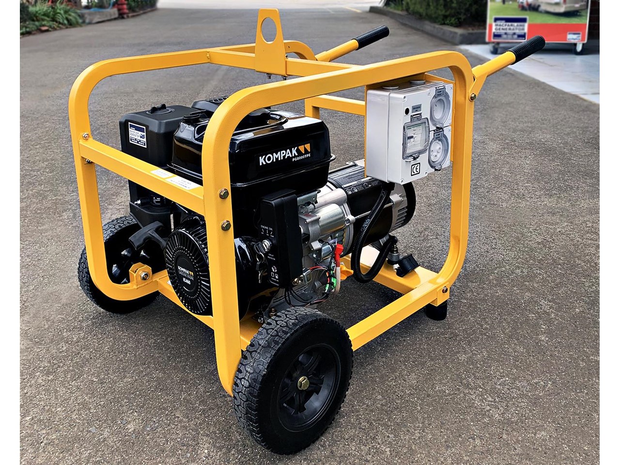 The New 1 phase Kompak PG8000TPE petrol generator is perfect for a worksite power source with 12.5hp OHV industrial engine, key and manual start, solid wheels and lifting hook, designed to meet Australian technical standards.