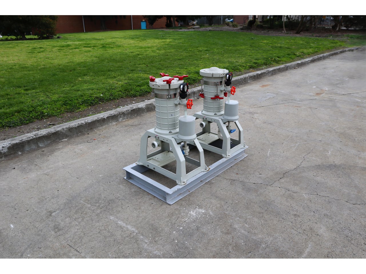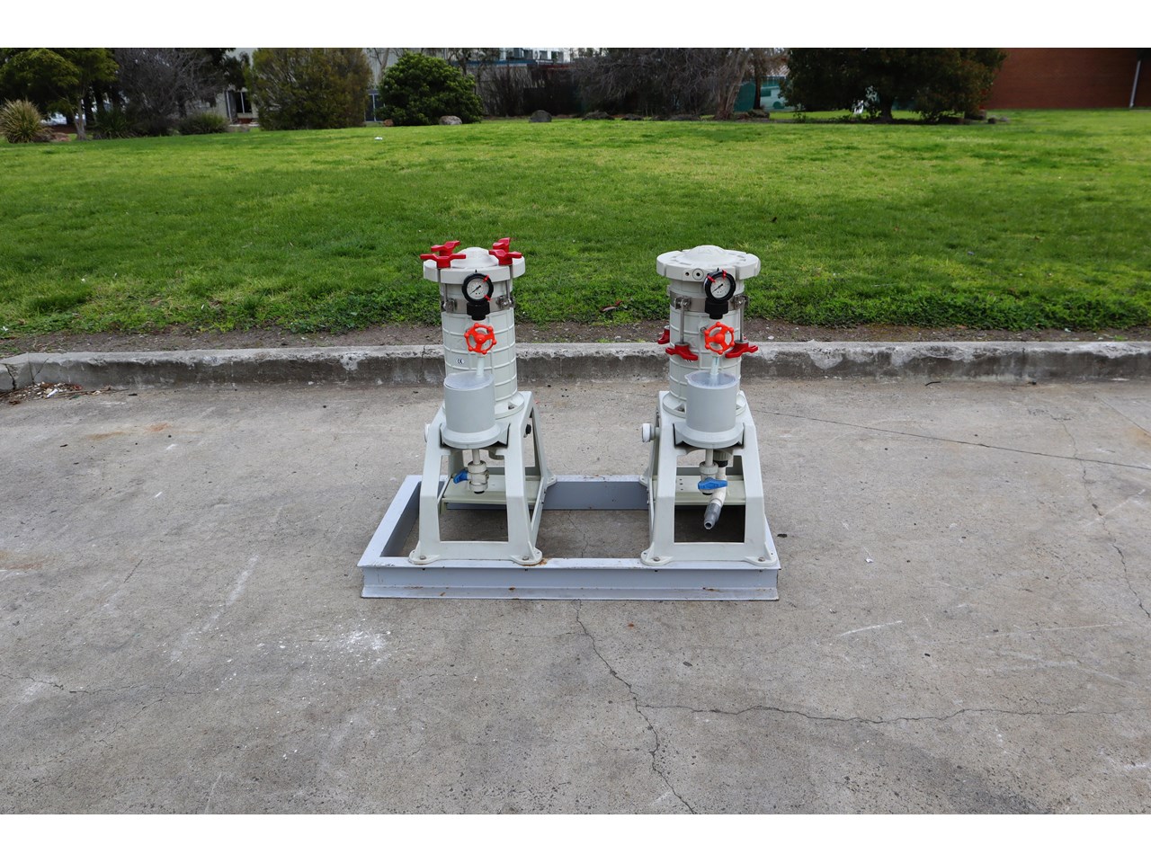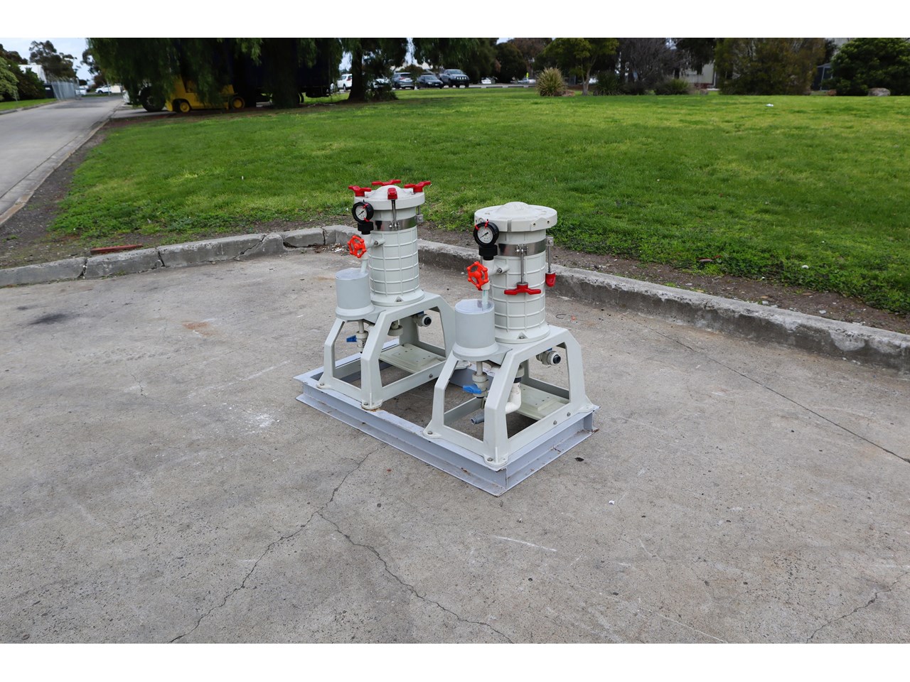 Pair of Lock Core Chemical Filters, mounted together on a welded steel skid.