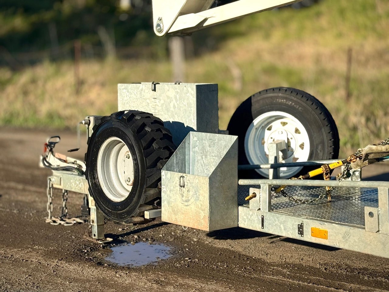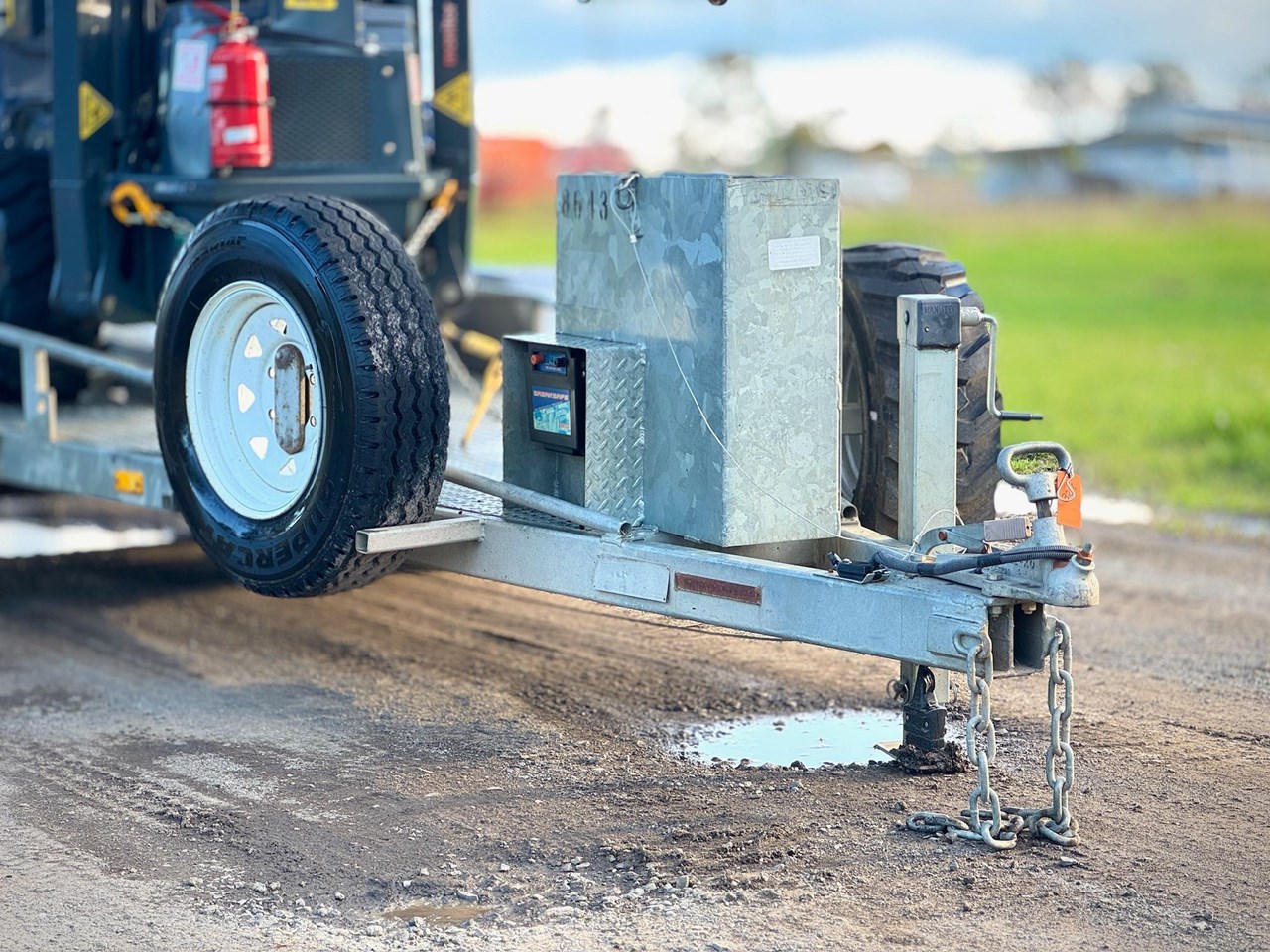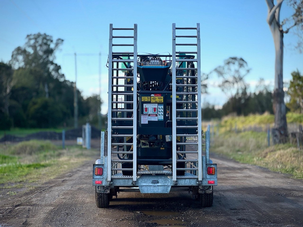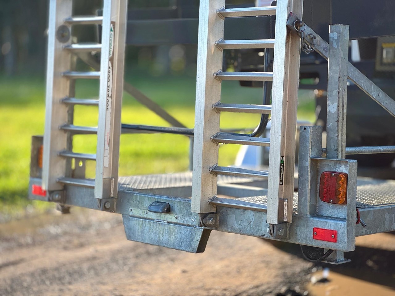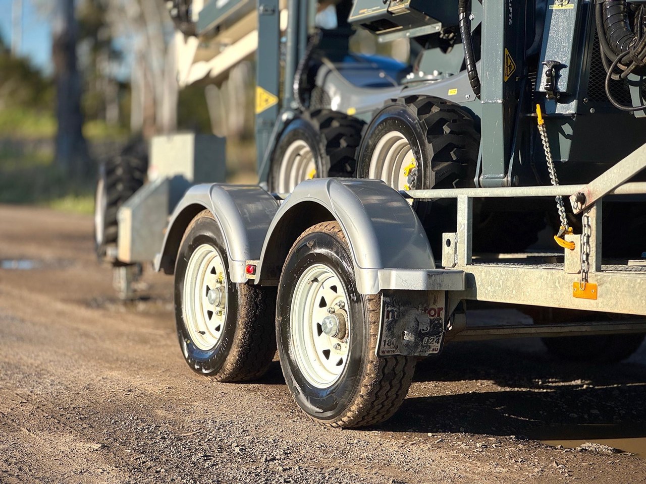 -Trailer specs - 50mm towball, 3200kg ATM, Jockey leg, Jerry can holder, Spare wheel x2, Mud guards, Dual axle, Ramps, Road light setup, Tiedown eyelets.