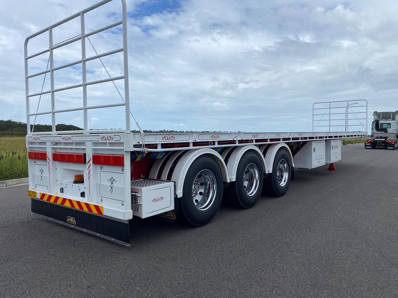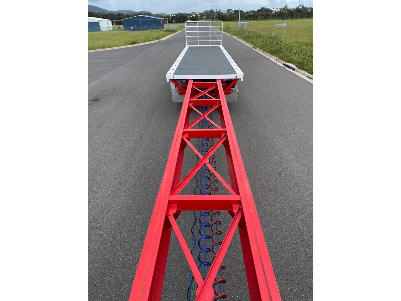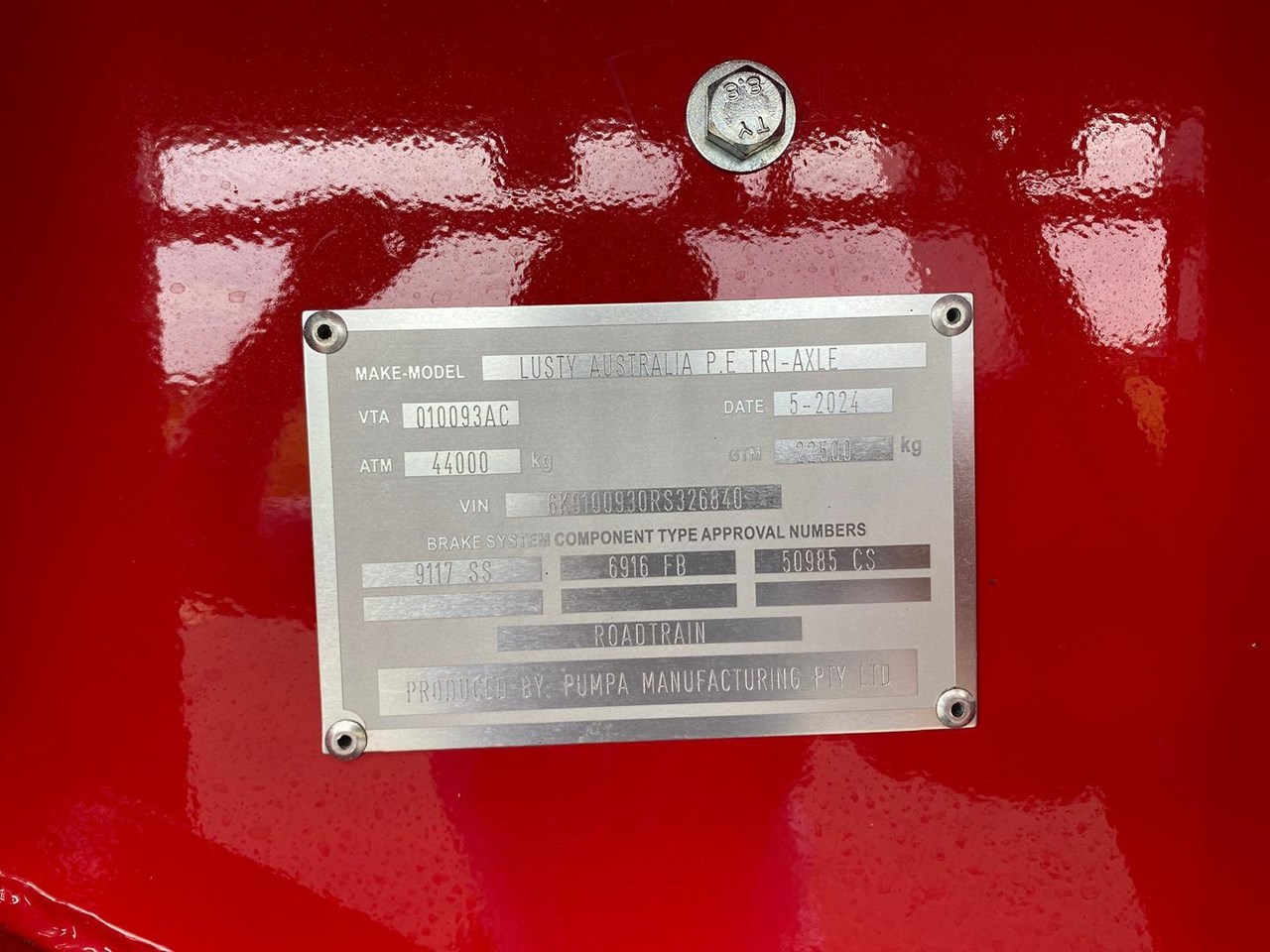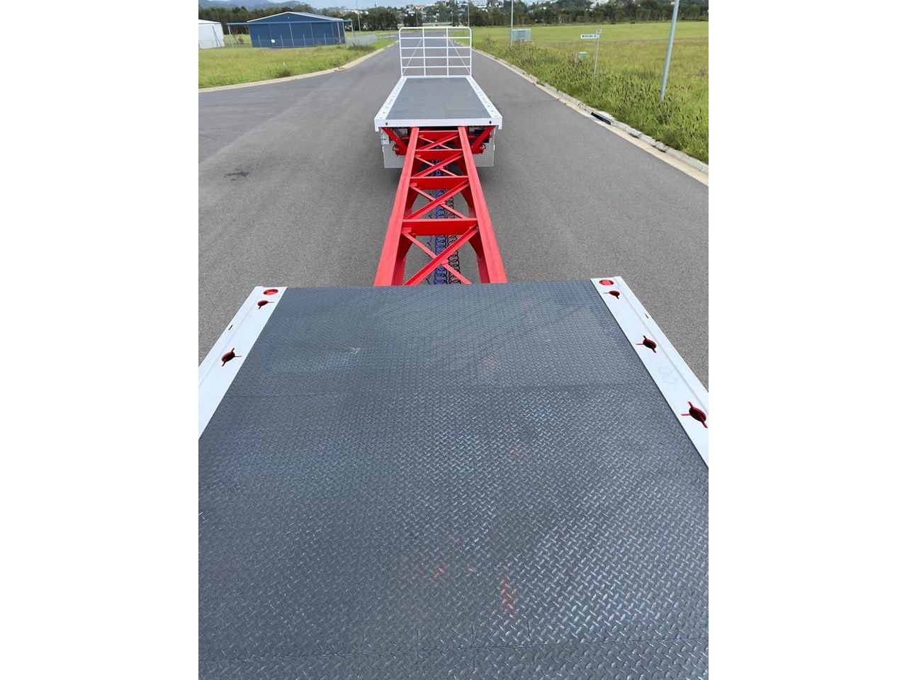 Road Train Lead Trailer / B Trailer, Extendable to 21.5m, BPW Axles and Airbag suspension, Chrome alloy Wheels, 3-way twist locks, Raise/lower valve, Right weigh gauge, Gate pockets, front and rear load racks, 4 x jumbo toolboxes, timber box, water tank, in track load binders, two position King Pin, 5" coamings, 3mm steel floor, In-deck tie down points, Long vehicle/Road train/Oversize signage, flashing light at rear, lines & scrolls. Tare weight 10.62T