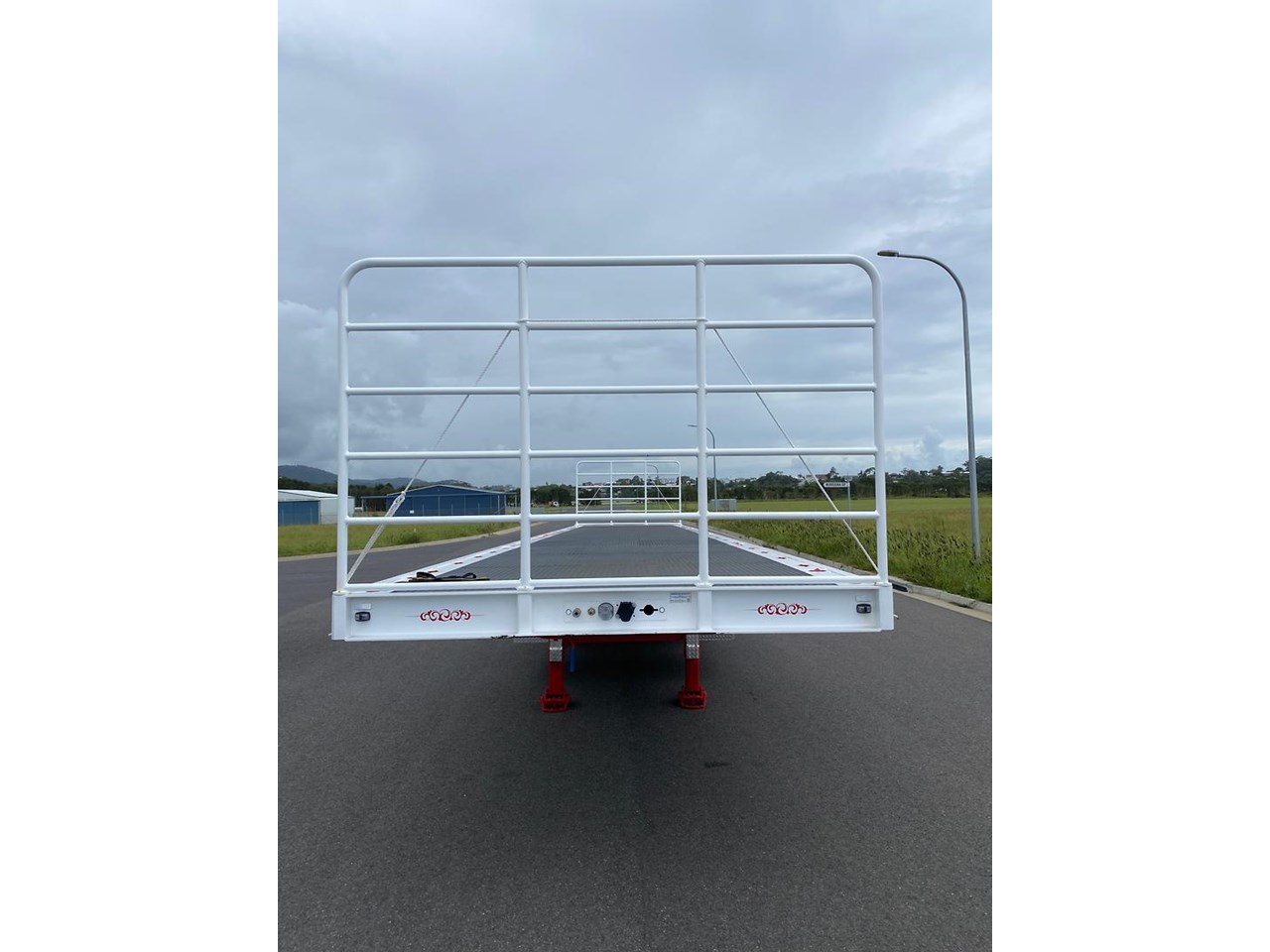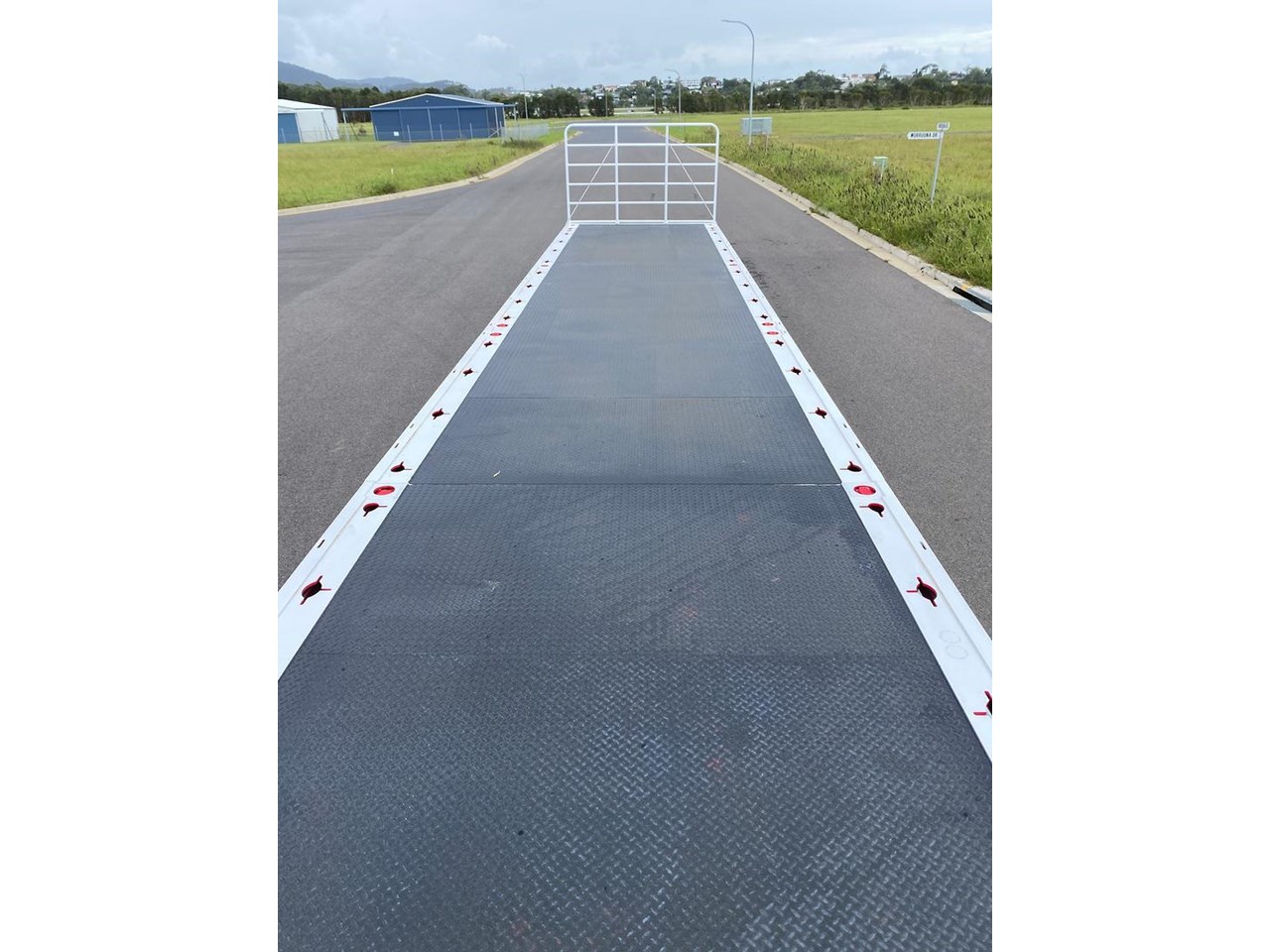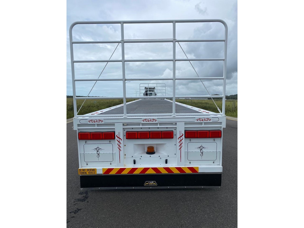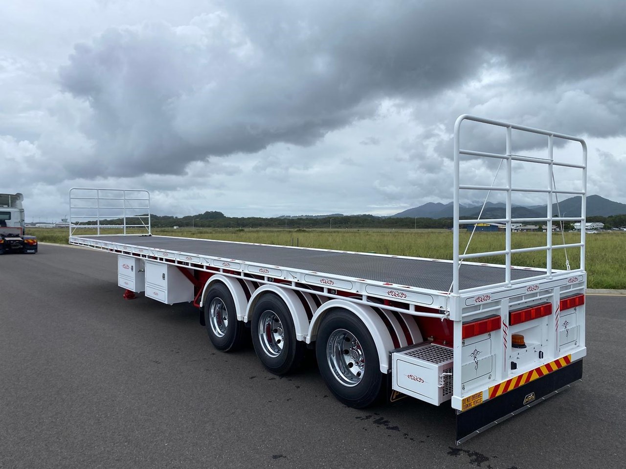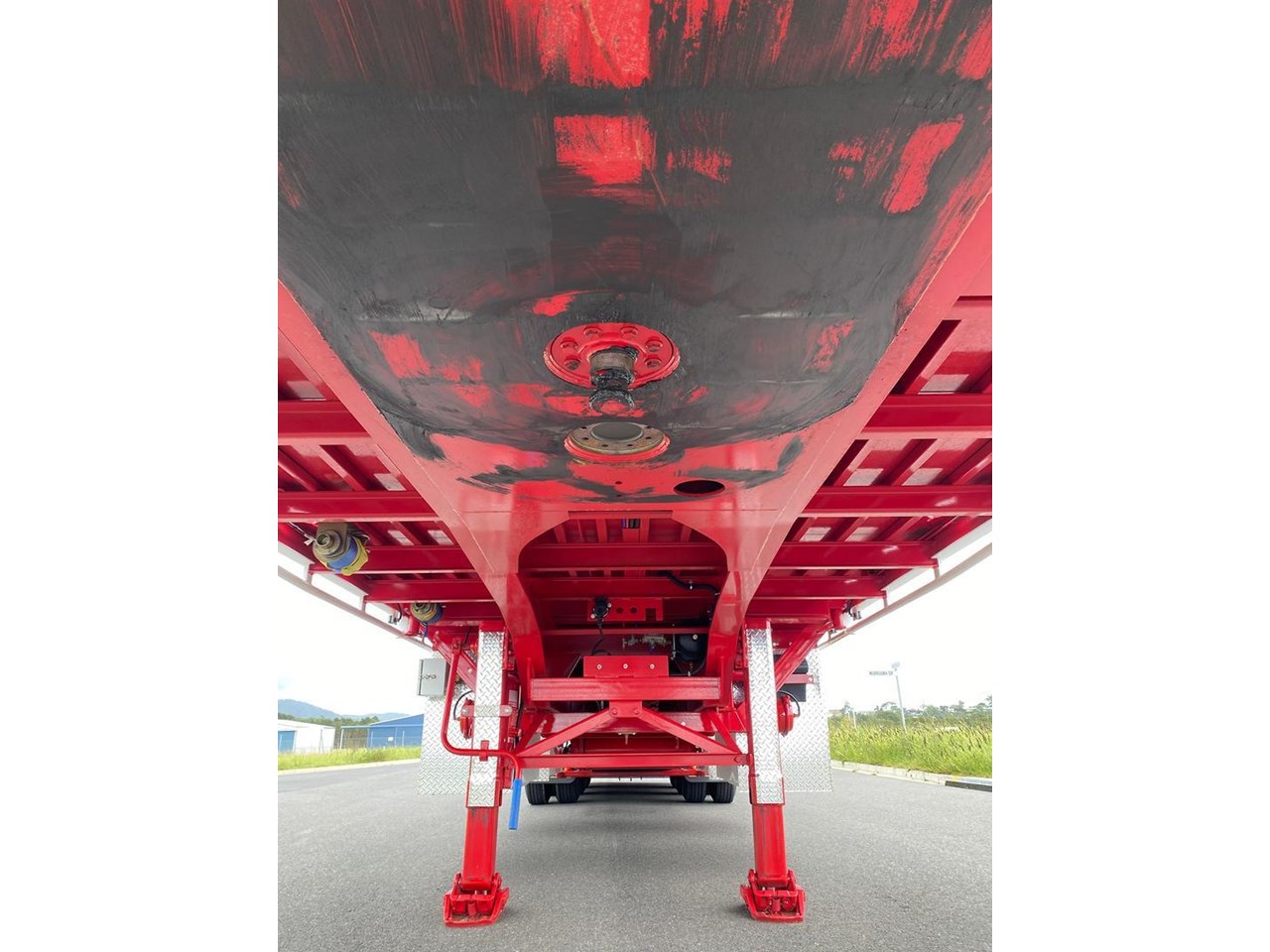 Road Train Lead Trailer / B Trailer, Extendable to 21.5m, BPW Axles and Airbag suspension, Chrome alloy Wheels, 3-way twist locks, Raise/lower valve, Right weigh gauge, Gate pockets, front and rear load racks, 4 x jumbo toolboxes, timber box, water tank, in track load binders, two position King Pin, 5" coamings, 3mm steel floor, In-deck tie down points, Long vehicle/Road train/Oversize signage, flashing light at rear, lines & scrolls. Tare weight 10.62T
