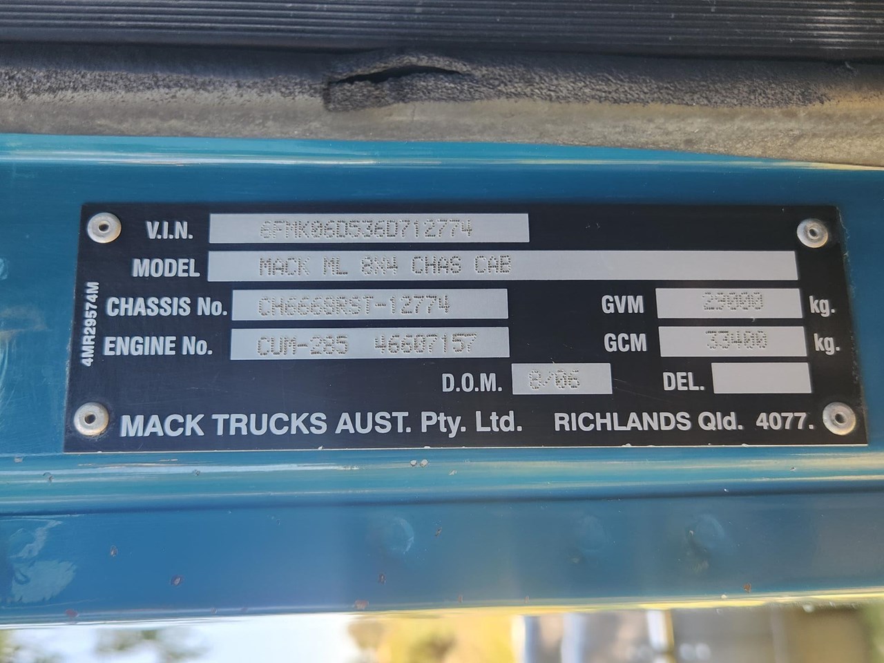 2006 Mack CH668 Metro-Liner 8x4 Automatic Cab/Chassis ( 2 Available & Several Iveco Acco 8x4 & 6x4's ) Cummins ISL 285HP 6 Cylinder Intercooled Turbo Diesel,Alison 6 Speed Automatic Transmission 8x4 ( Bogie Drive Twin Steer ) Air Conditioning,Diff Lock,Alcoa Rims GVM 29000. GCM 33400 Wheelbase-5400 Usable Chassis Length-4800. Chassis Width-860 Price includes GST & Tax Invoice Competitive finance available Delivery arranged to any state Independent inspections welcome Other 8x4 Trucks in stock including Iveco Acco,Volvo,Mercedes Benz,Mack CH Fleetliner & ML Metroliner Cab/Chassis,Traytop,Tipper,Prime Mover,Beavertail,EWP,Curtainside,Refrigerated Pantech,Water Trucks & Fire Trucks 8x4 6x4 6x2 4x2 4x4 Ex Govt,Council,Forestry,National Parks,SES,Rescue Squad,Fire & Rescue Service,Rural Fire Service & Major Fleets Established 1991 with over 200 Trucks in stock