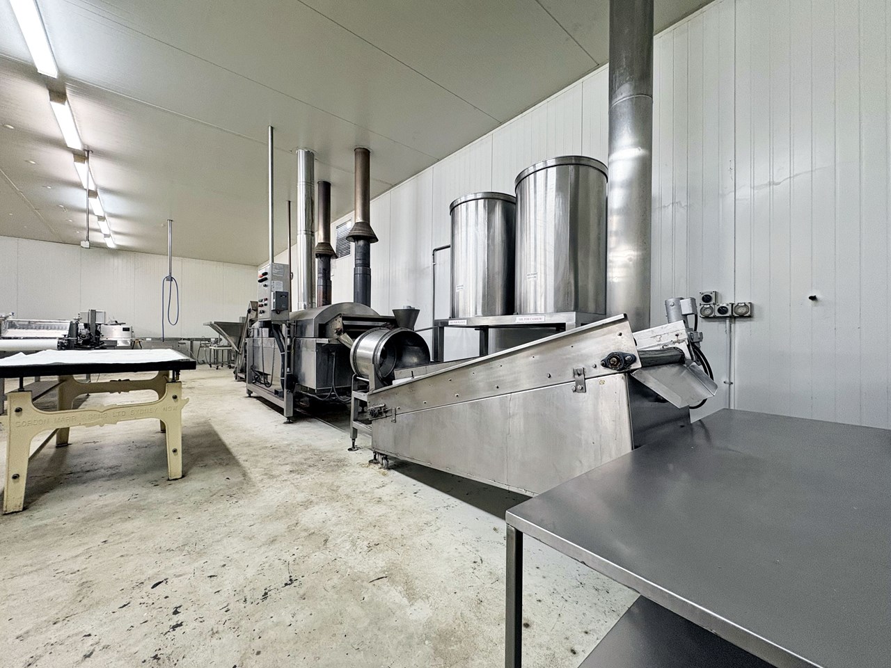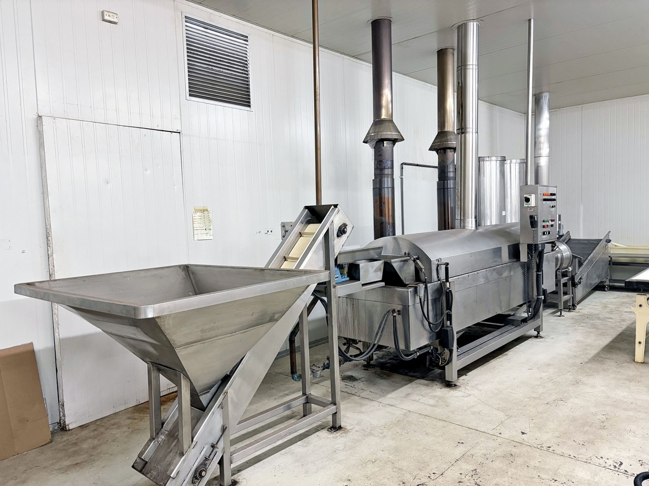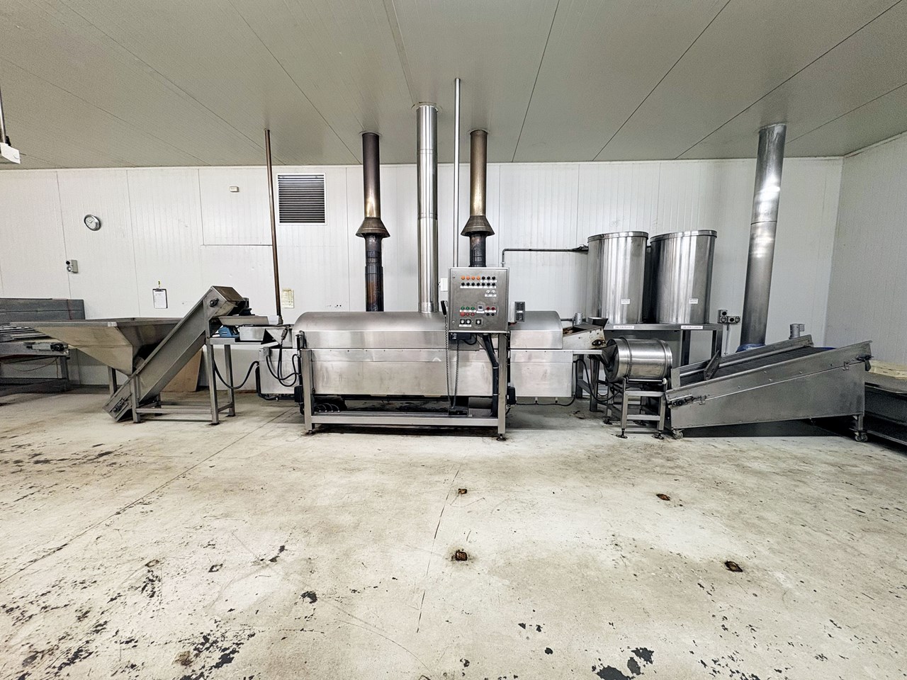 Stainless Steel Motorised Gas Fired Nut Oil Roaster, Comprising Raw Nut Load Hopper, Cleated Rubber Belt Elevating Conveyor, Vibratory Dust/Fragment Sieve Head, Stainless Steel Oil Bath Roasting Tunnel with Overhead Hood and Extraction Ducts to Atmosphere, Mesh Belt Pass Through Conveyor, Take Out Slide with Overhead Salt/Flavouring Head, Rotary Mixing Drum and Stainless Steel Mesh Belt Elevating Outfeed Conveyor, Twin Stainless Steel Oil Storage Drums on Stand each Approx 300 Litre, Control to 415V 3 Phase Electric Motor and Switch and Stainless Steel Mobile Nut Collection Bench (Capacity Approx 3-4 Tonne Per Day)