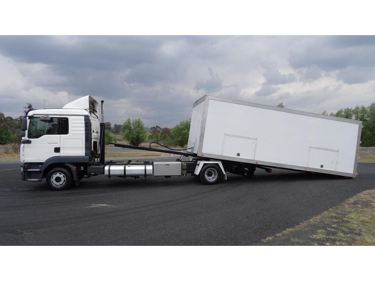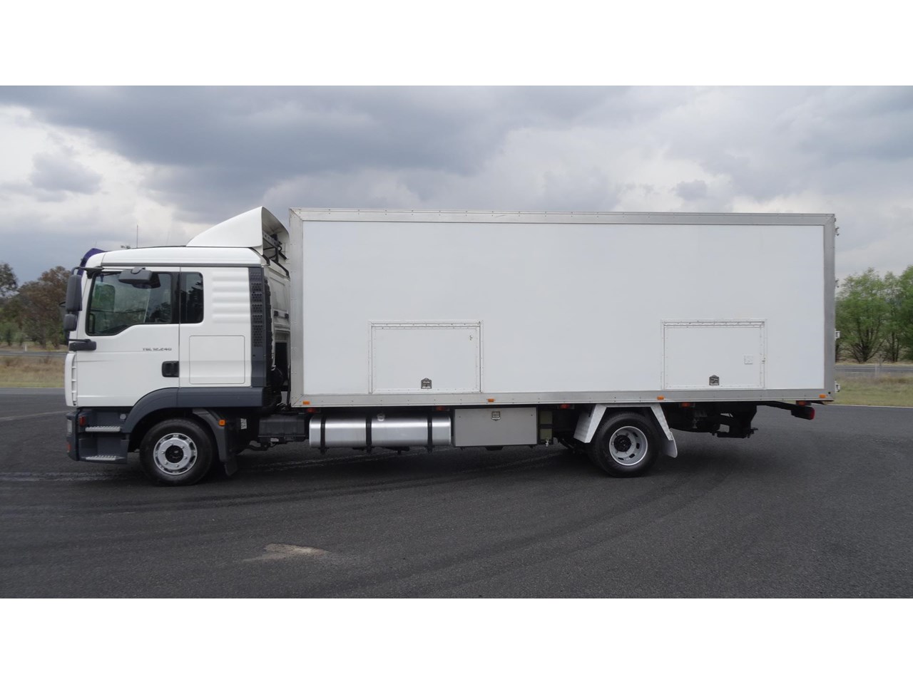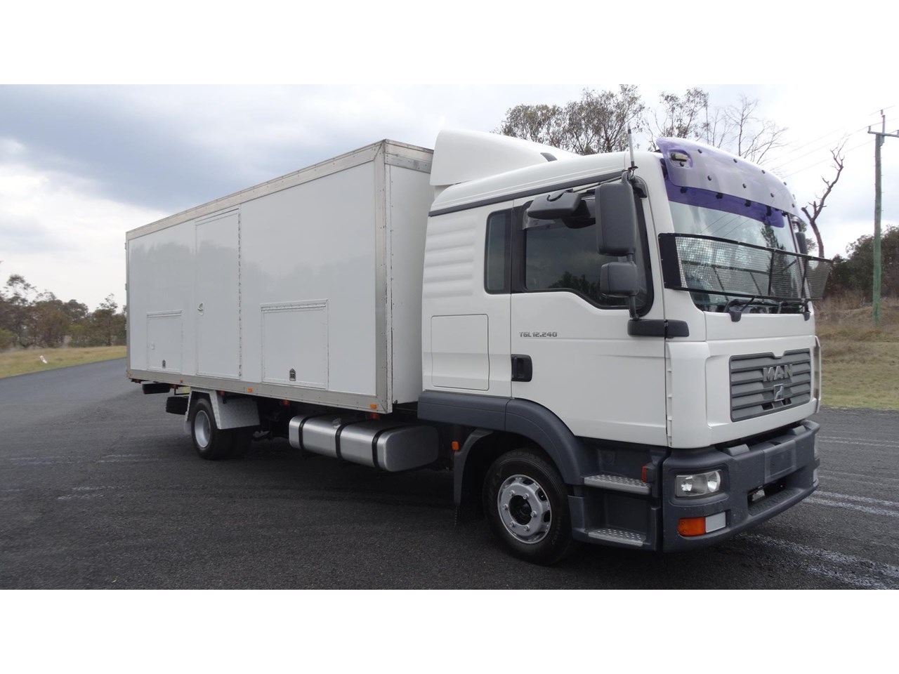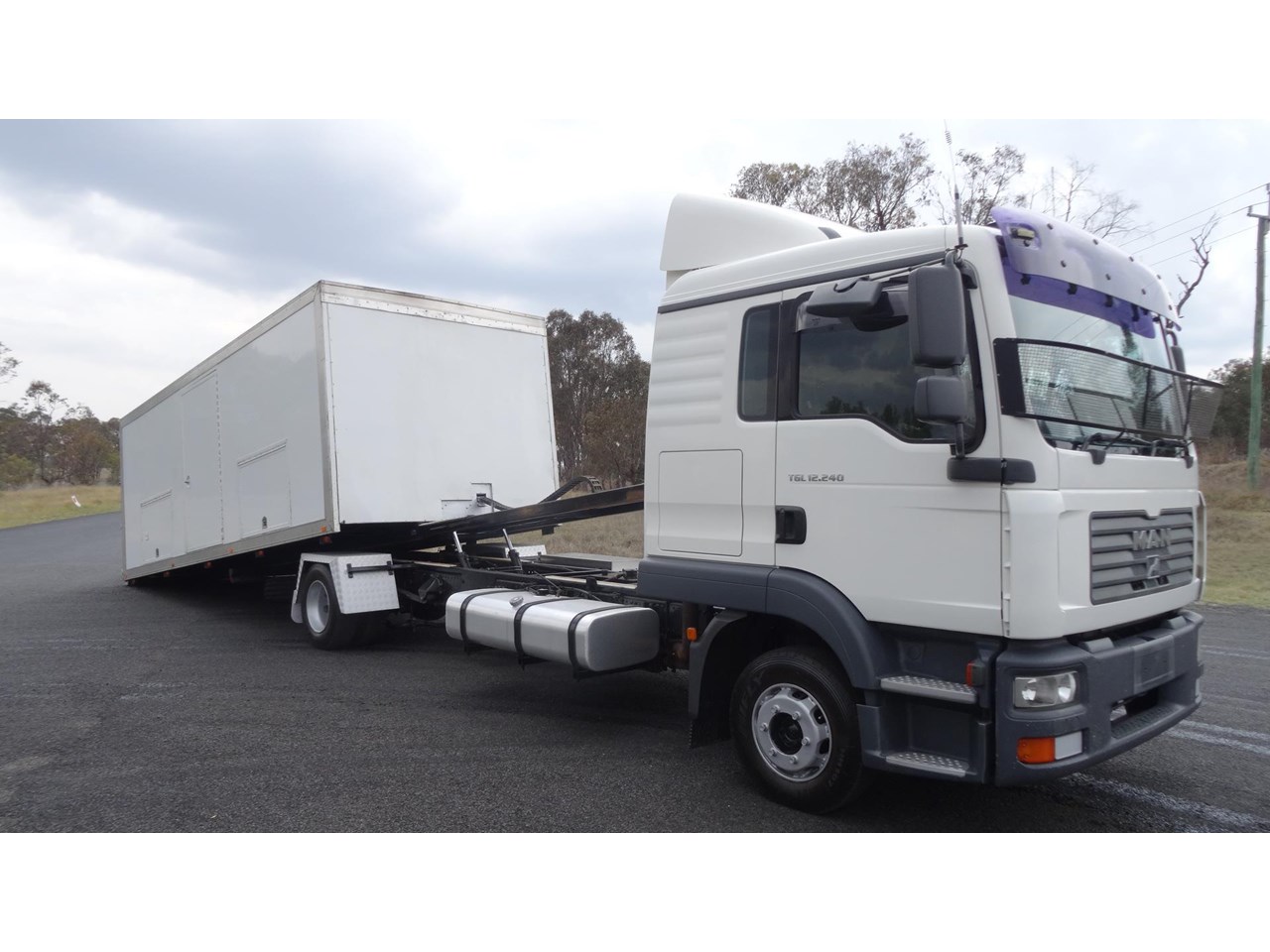 MAN TGL 12.240 TILT SLIDE WITH INCLOSED PAN , YEAR - 01/2007, LOW 267300 KMS, 240 HP TURBO INTERCOOLED, ZF AUTOMATIC WITH NO CLUTCH, GOOD SIZE SLEEPER IN CAB, EKEBOL BRAND BODY WITH FULL REMOTES, 11990 GVM, 16480 GCM, 5200MM WHEELBASE, 6300 MM L X 2350MM W X 2000MM H INSIDE MEASUREMENTS, HYDRUALIC WINCH FITTED INSIDE PAN, , 4 AIRBAG SUSPENSION, DUAL FUEL TANKS, REAR TOWBAR FITTED, TRUCK DRIVES LIKE A CAR AND GOES VERY WELL, S/N - 2262, PRICE - $119,900.00 INC GST, LOCATED IN ARMIDALE NSW