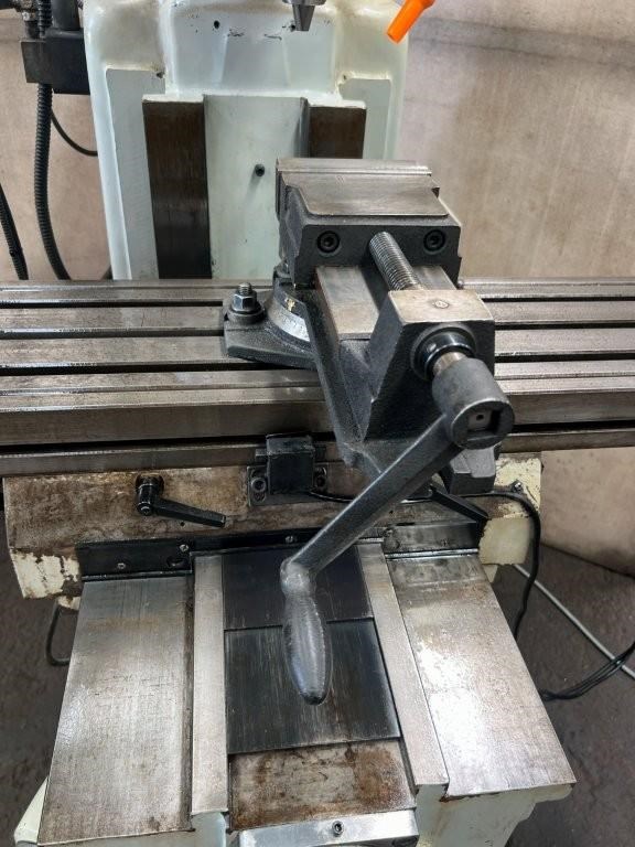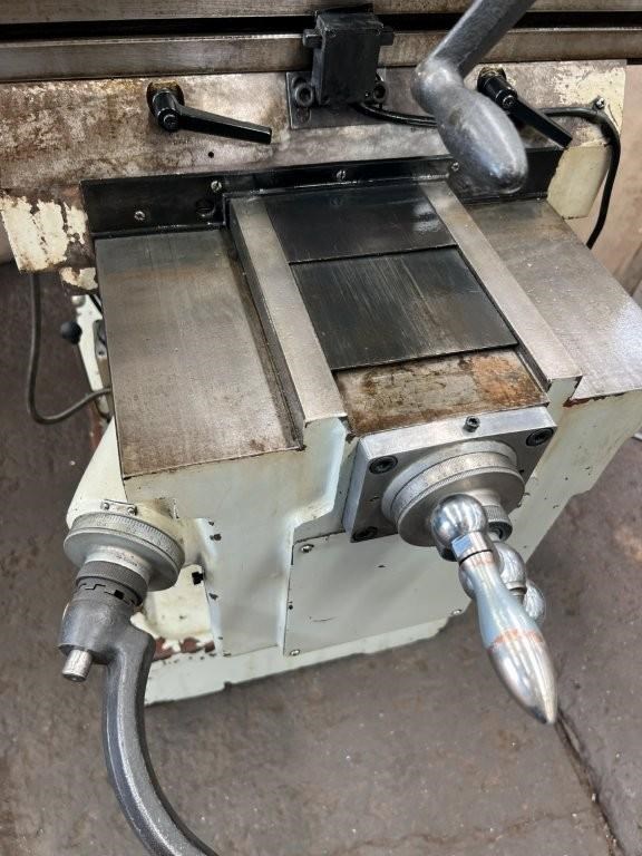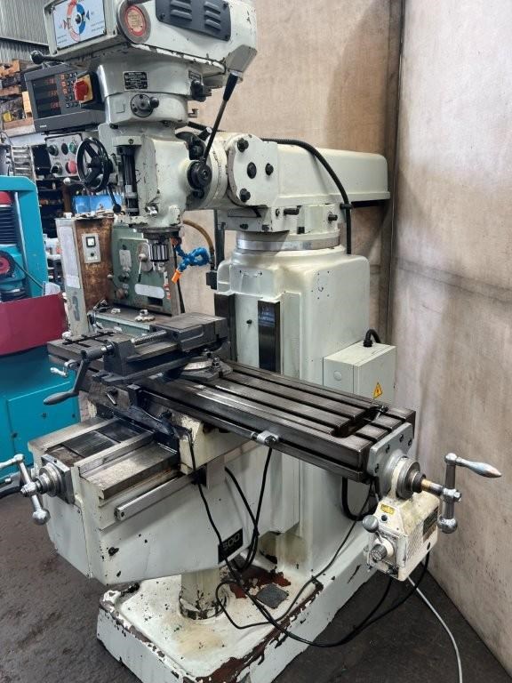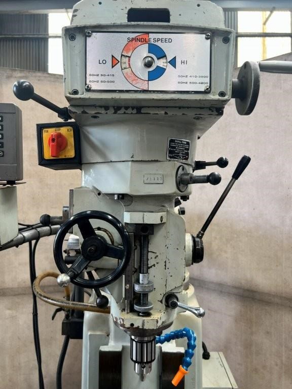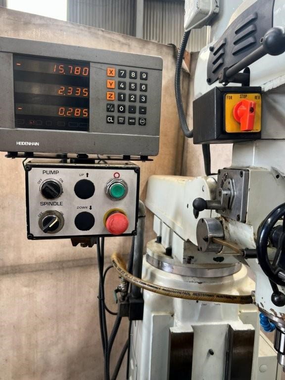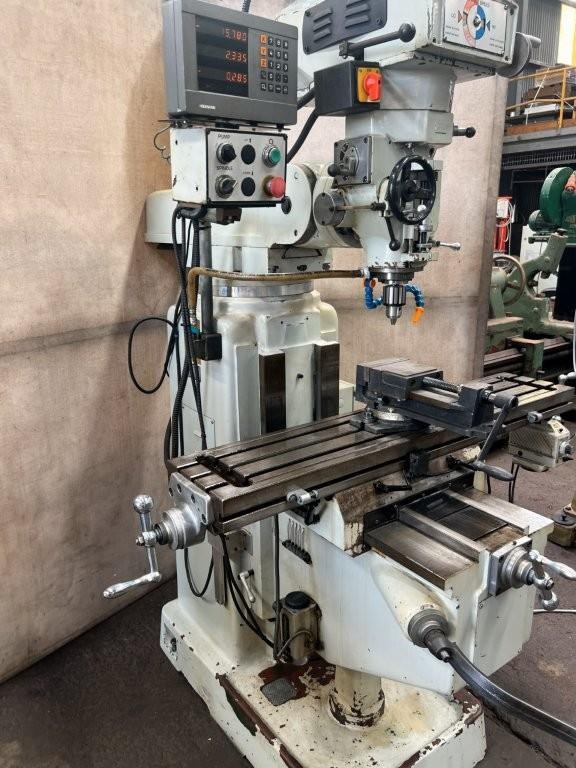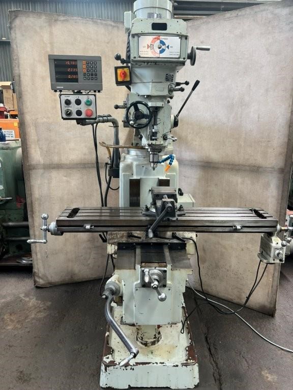Power feed to X axis, 3 axis DRO, 5hp 415volt vice and drill chuck.