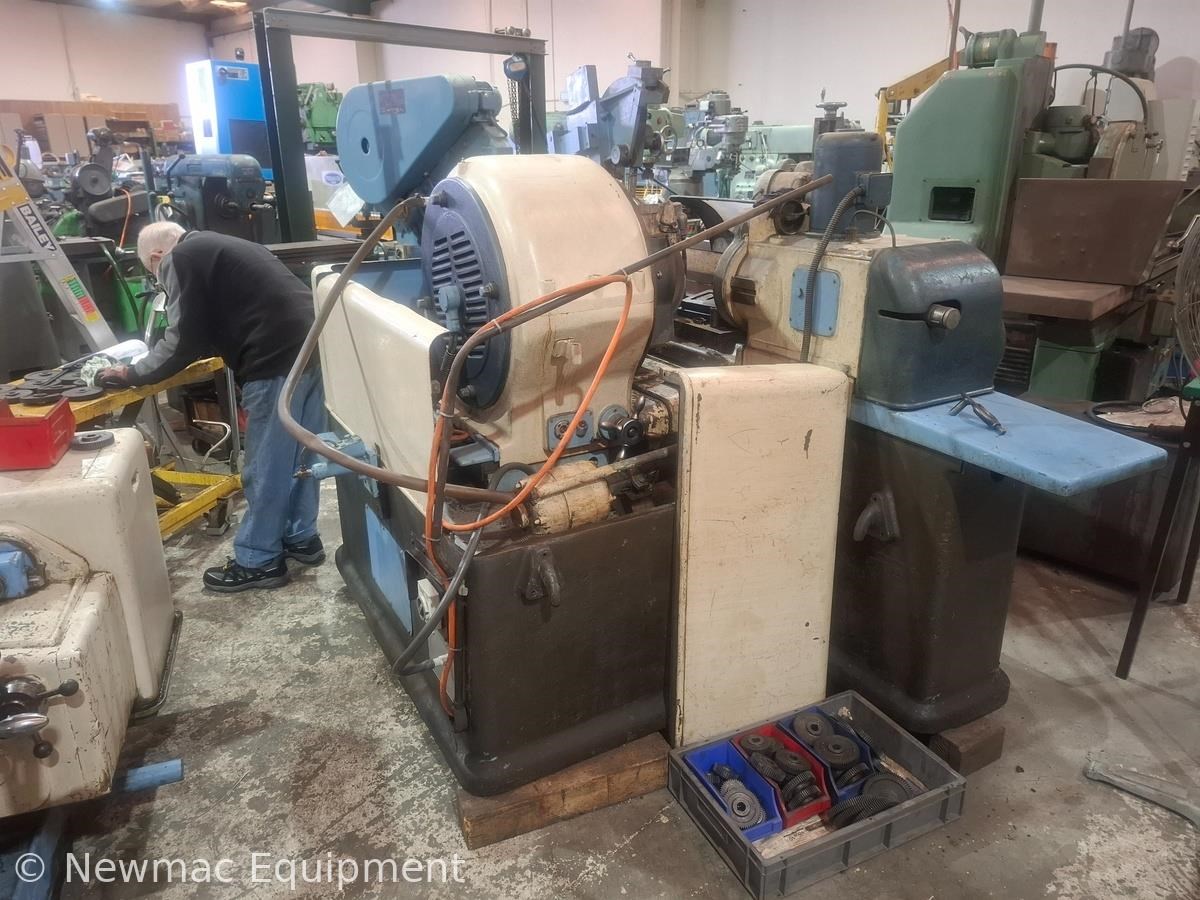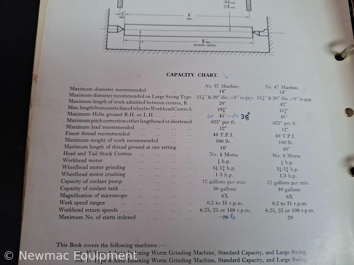 This Matrix No. 37 Automatic Indexing Worm Grinding Machine is designed for precision grinding of worms and similar components. Built for high accuracy, it handles a wide range of diameters, thread pitches, and helix angles, making it suitable for both standard and large swing workpieces.