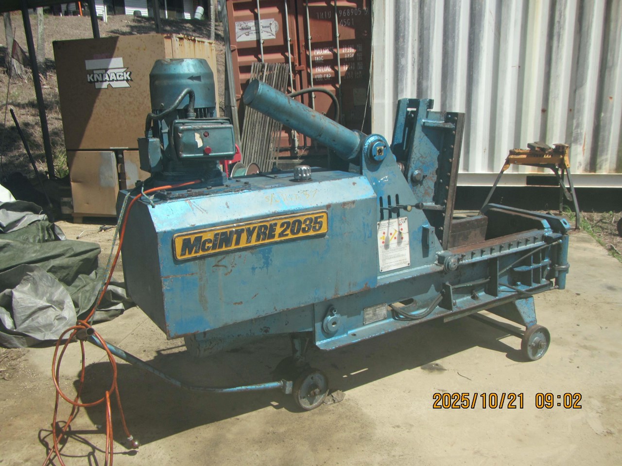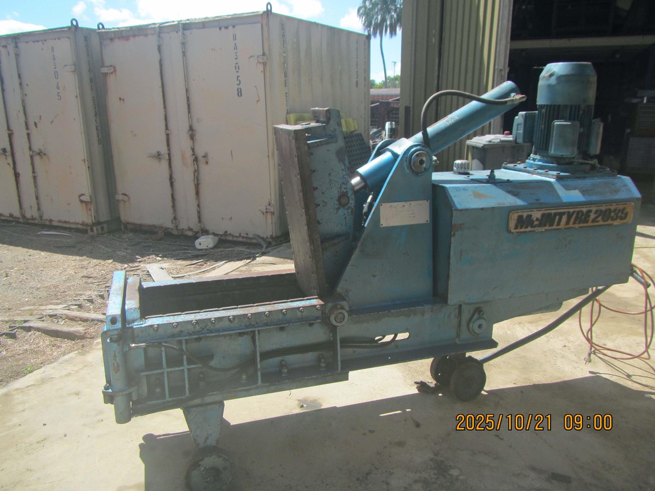 Metal baler, McIntyre model 2035, non ferrous metal baler, electric hydraulic powered, 10HP/7.5 KW 3 phase motor, unit mounted on wheels, manual control, produces a 355mm x 200mm bale, unit weight 1860 kg, good condition,ex Mackay.