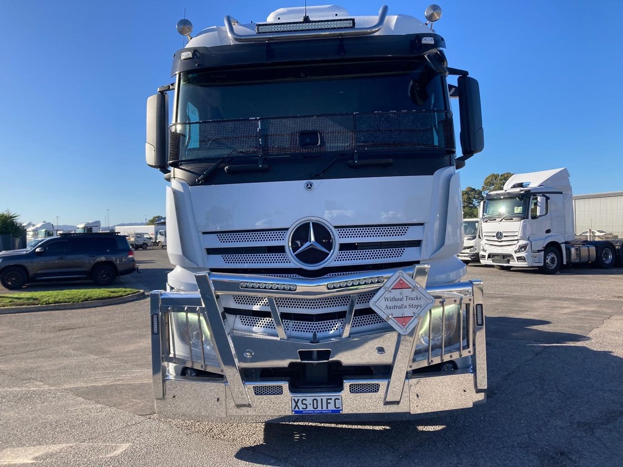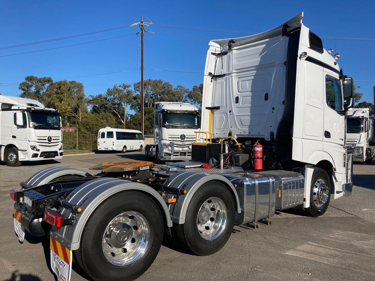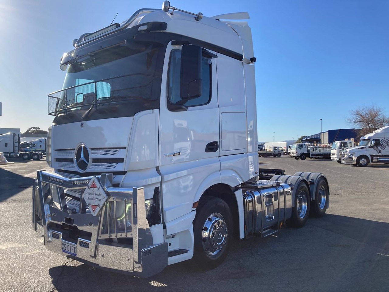 2022 Mercedes Actros 2658 6x4 Road train / B-Double prime mover, 580hp Mercedes OM473 engine, 12 speed Mercedes AMT transmission, Mercedes Hypoid drive axles on air bag suspension, alloy bull bae, Dometic bunk cooler, integrated sleeper cabin, Jost 50mm fixed turntable, new drive guards, will be sold with SA roadworthy, ex major fleet in excellent condition