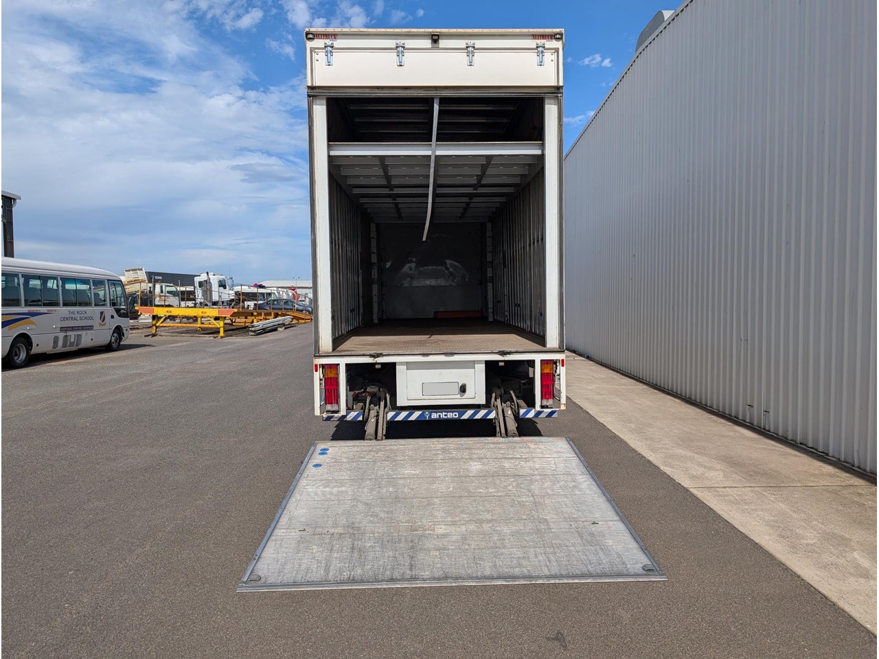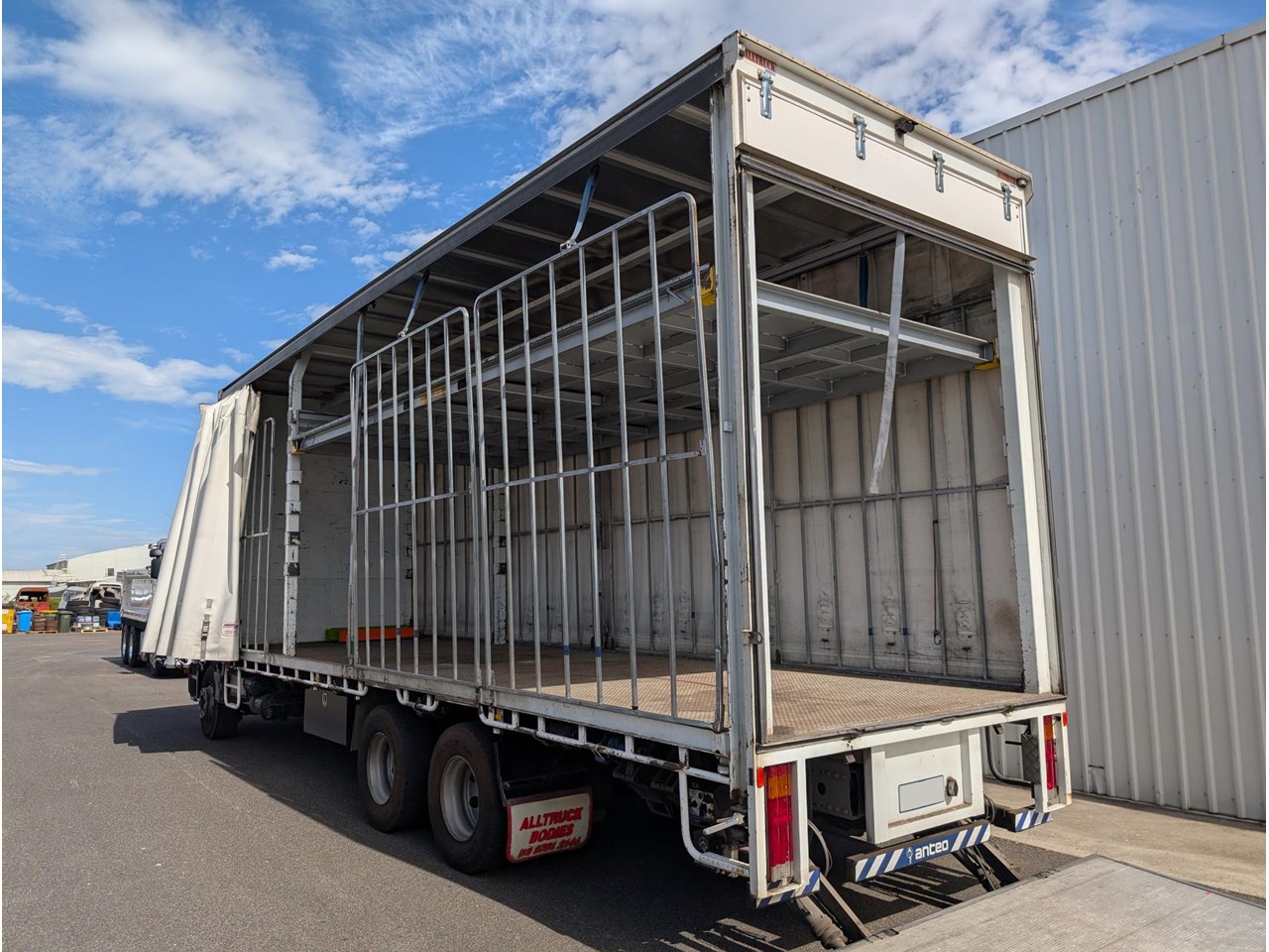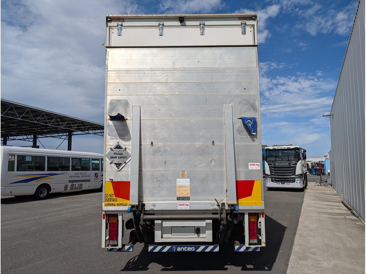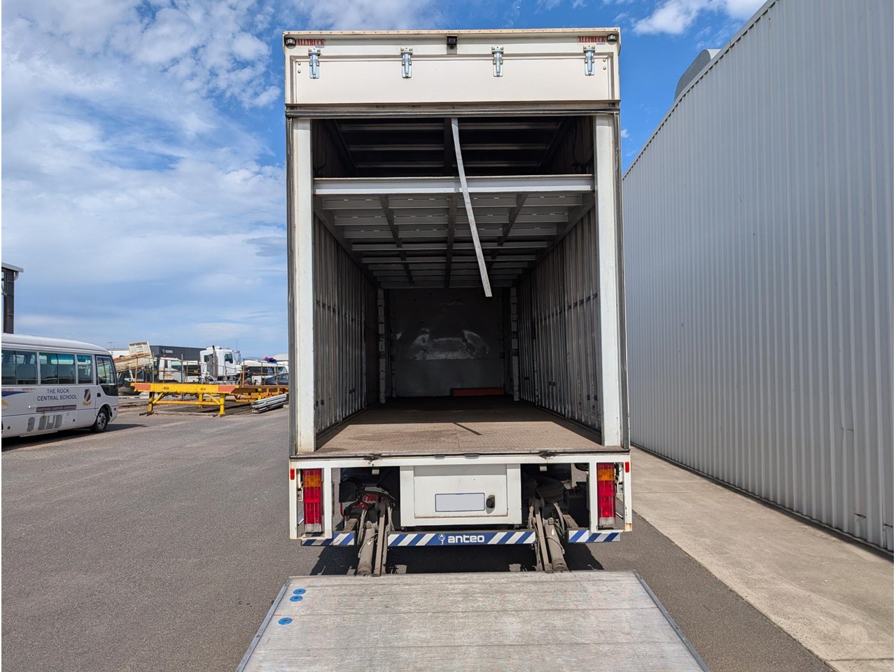 Day Cab, 290HP 6 Cyl Turbo Intercooled Diesel, 8 Speed Synchromesh Manual, GVM: 23,000kg, Lazy Axle on Airbag Suspension with Raise / Lower Control, Axle Lock, ABS Brakes, Air Drivers Suspension Seat with Lumbar Control, Power Steering, Tilt/Tele Steer Column, Power Windows, Electric & Heated Mirrors, Air Conditioning, CD/Tuner Infotainment Unit, Reverse Camera, f/w 14 Pallet AllTruck Jumbo Curtainsider Body (Internal Measurements 8.80m L x 3.1m H), Steel Chequerplate Floor, Raised Edge Coaming with 7 x 2.4m H Hanging Gates, 1 x 6.15m L Mezzanine Deck in Rear Section with Provision for 2nd Mezzanine in Front Section, 6 x Load Binders in Tracks, Front & Rear Curtain Tensioners, Sealing Type 2.2Ton Anteo Aluminium Cantilever Tailgate with Foot Controls, Roof Mounted Air Foil Kit, Fuel Tank & AdBlue Tank on Drivers Side, Passenger Side Mounted Toolbox, 305/70R19.5 Tyres on 8 Stud Steel Rims & LED Lights.