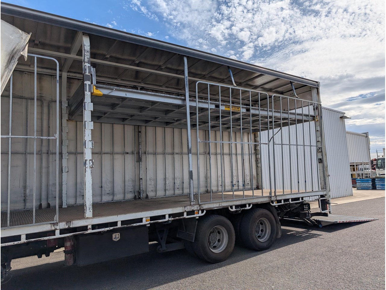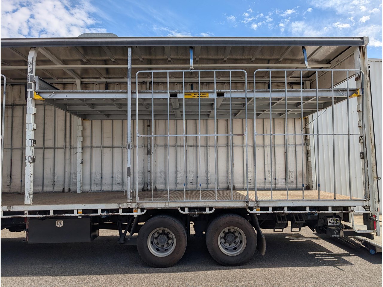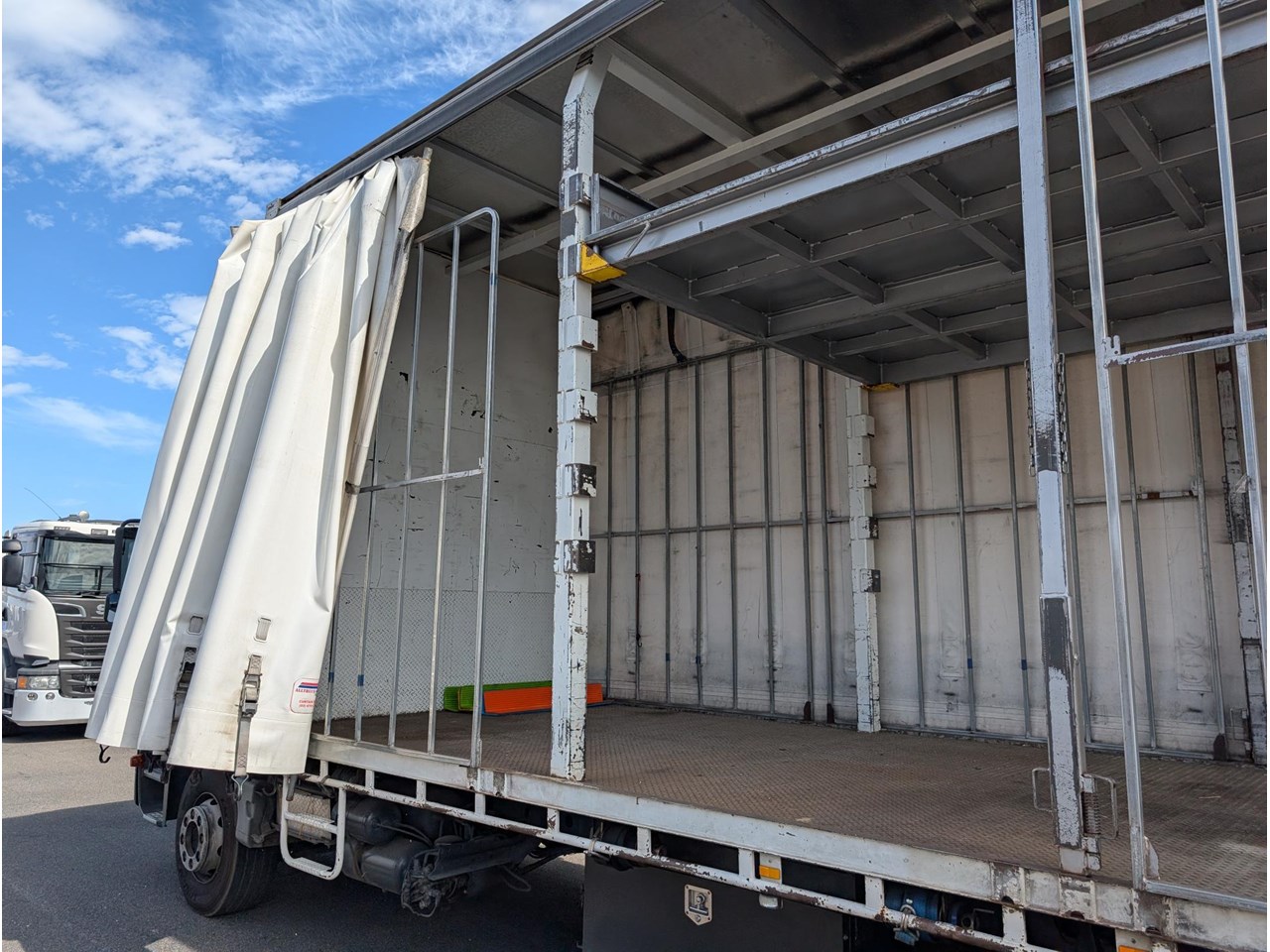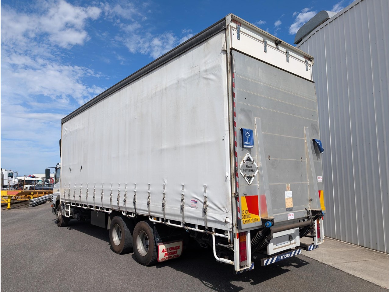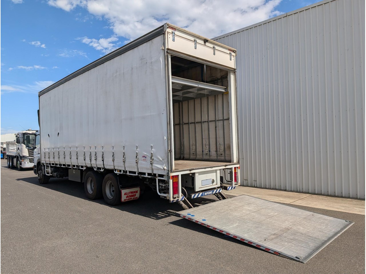 Day Cab, 290HP 6 Cyl Turbo Intercooled Diesel, 8 Speed Synchromesh Manual, GVM: 23,000kg, Lazy Axle on Airbag Suspension with Raise / Lower Control, Axle Lock, ABS Brakes, Air Drivers Suspension Seat with Lumbar Control, Power Steering, Tilt/Tele Steer Column, Power Windows, Electric & Heated Mirrors, Air Conditioning, CD/Tuner Infotainment Unit, Reverse Camera, f/w 14 Pallet AllTruck Jumbo Curtainsider Body (Internal Measurements 8.80m L x 3.1m H), Steel Chequerplate Floor, Raised Edge Coaming with 7 x 2.4m H Hanging Gates, 1 x 6.15m L Mezzanine Deck in Rear Section with Provision for 2nd Mezzanine in Front Section, 6 x Load Binders in Tracks, Front & Rear Curtain Tensioners, Sealing Type 2.2Ton Anteo Aluminium Cantilever Tailgate with Foot Controls, Roof Mounted Air Foil Kit, Fuel Tank & AdBlue Tank on Drivers Side, Passenger Side Mounted Toolbox, 305/70R19.5 Tyres on 8 Stud Steel Rims & LED Lights.