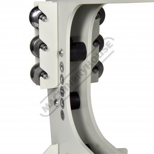 The upper wheel and seven lower anvils are hardened to 45-50 HRC, ensuring durability and a long service life. A standout feature of this model is the pivoting wheels, which rotate 90° to sit parallel with the frame-making it much easier to handle longer projects.