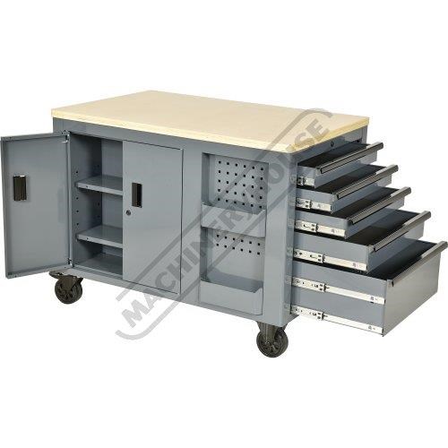 The Mobile Work Station offers ten drawers, adjustable shelving, hanging hooks, and side storage, with soft-close drawers, safety locks, foam liners, and oversized caster wheels for easy mobility.