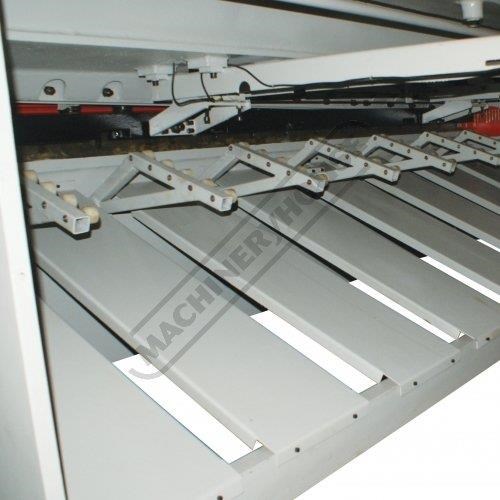 Pneumatic operated material sheet supports mounted to rear of machine. This feature assists in shearing thin material to the correct cut length required simply by preventing thinner material flexing and falling below the backgauge prior to shearing.