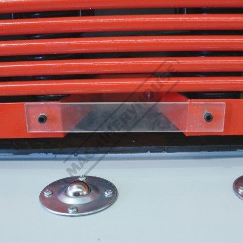 Pneumatic operated material sheet supports mounted to rear of machine. This feature assists in shearing thin material to the correct cut length required simply by preventing thinner material flexing and falling below the backgauge prior to shearing.