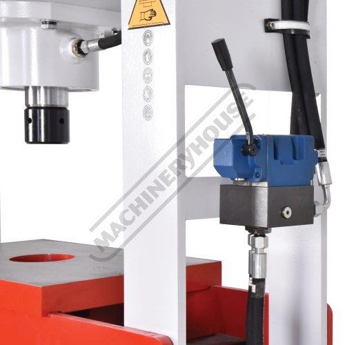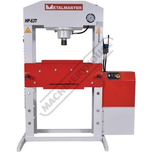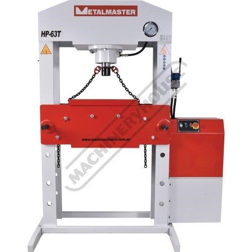 The Metalmaster HP-63T, 63 Tonne electric/hydraulic press is ideal for pressing, bending, forming, straightening and a whole variety of operations. The hydraulic system is equipped with a pressure guage and a joystick lever to control the operation. A heavy one piece steel workplate and a pair of pressing blocks are supplied as standard equipment.