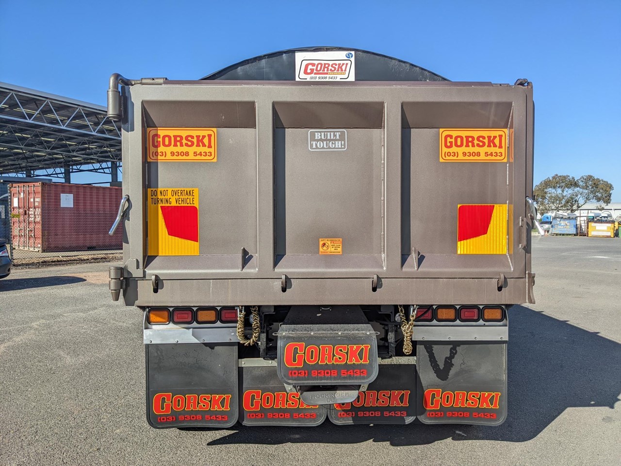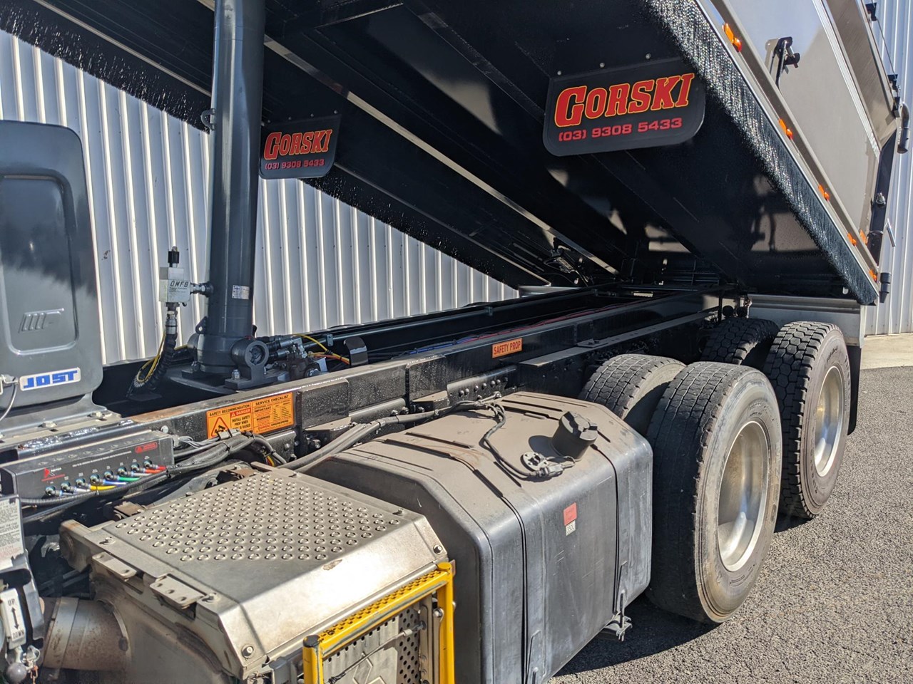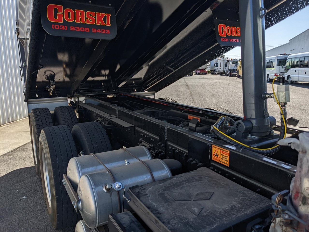 Sleeper Cab, 455HP Turbo Diesel, 12 Spd Automatic, GCM: 63,000kg, Bogie Drive on Airbag Suspension with Diff Lock, Fitted With Brand New Gorski 10m³ Tipper Body, 2 Way Air Tailgate, Razor Electric Tarp & Plumbed for Dog with Air & Oil to Rear. GENUINE LOW 259,000kms & 6,378Hrs from New!