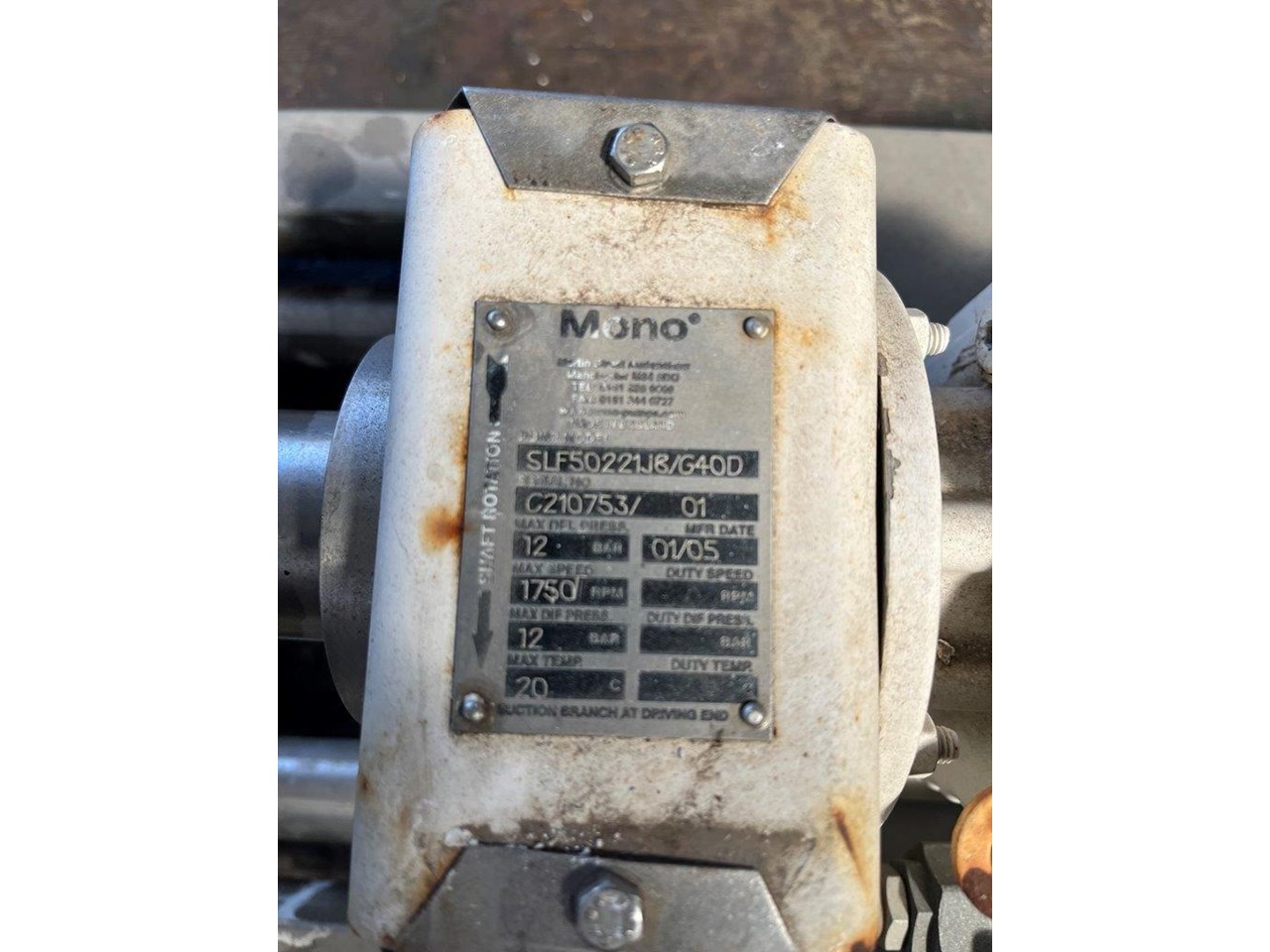 Mono pump on skid. Model LF502 3 phase 0.37kW SEW Geared motor. Max Differential Pressure: 12BAR Max Speed: 1750RPM Temp: 20