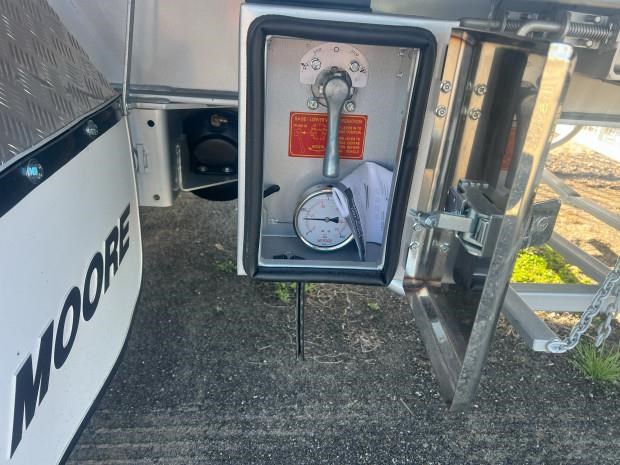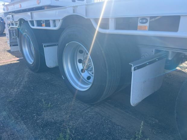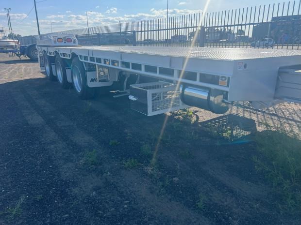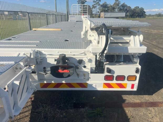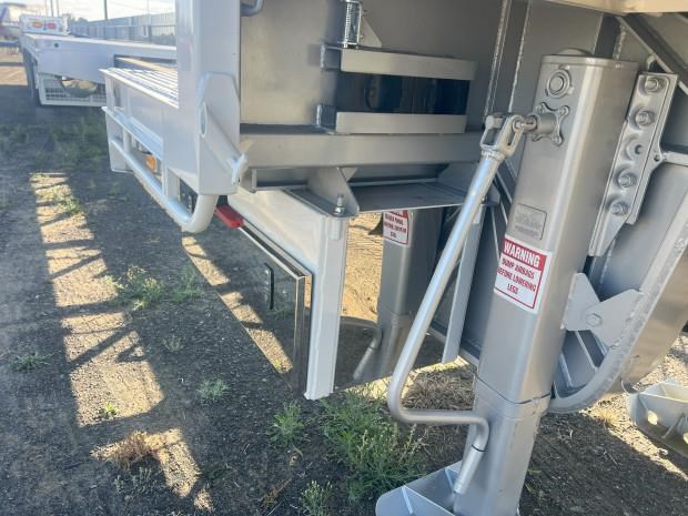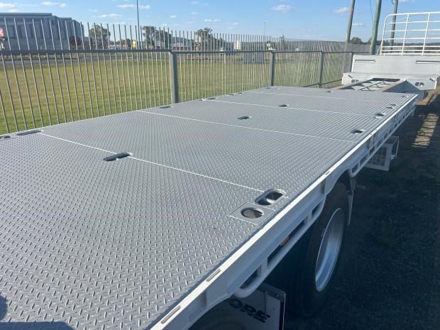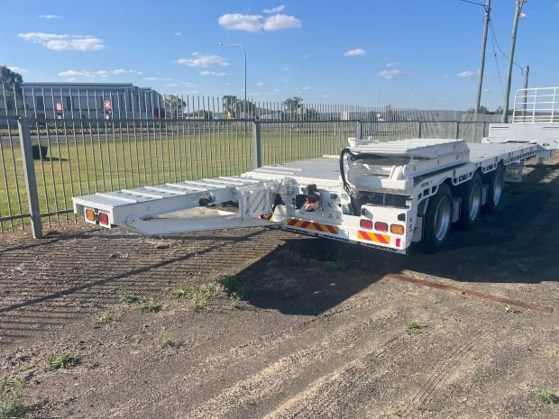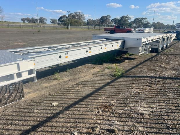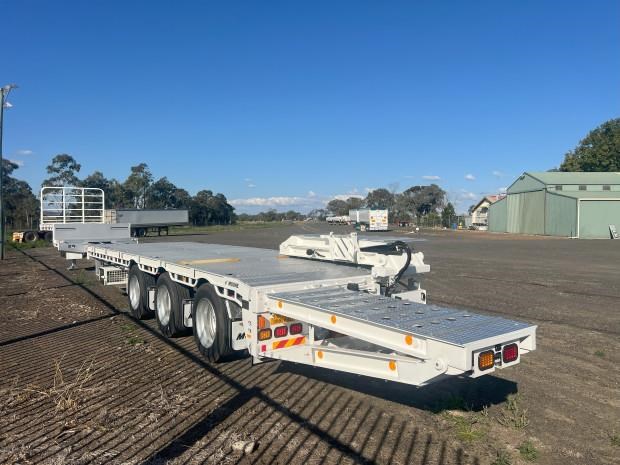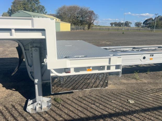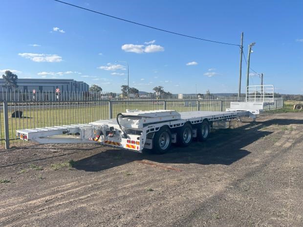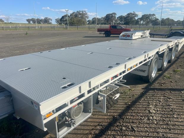 2025 Moore 45' Triaxle Dropdeck Extendable. 13' Top deck - 32' Bottom deck including ramps. Hendrickson Intraax Suspension and Intraax HXL7 10/285 axles - 1100mm deck height. 275 Tyres on steel rims, 3 Way Container Pins with stands and levelling beam. 14' Bi-Fold Laydown & Layback Ramps using Kubota Diesel Powerpac. 2 Toolboxes, 1 watertank, Timberbox and twin tyre carrier. 4 Pipe Bolsters and storage per side. RIghtweigh Bluetooth scales. Roadtrain lead with coupling. 3mm Checker plate top deck and 5mm Checker plate bottom deck with oval tie downs in floor.