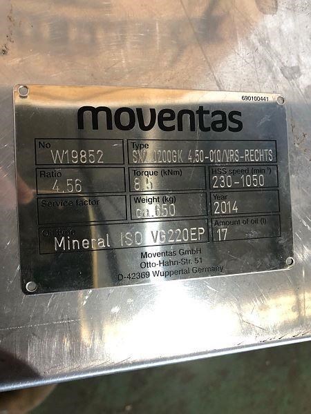 MOVENTAS Gearbox. Unused Type SX2 0200GK 4.50-010/VRS LINKS (Left) and RECHTS (Right) serial numbers W19852 W19853. Ratio 4.56. Weight 650kg. Year 2014. 100mm dia drive shaft dia. 2 Gearboxes available, price per box.