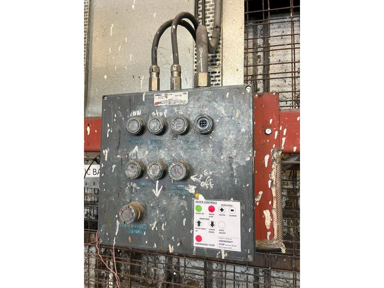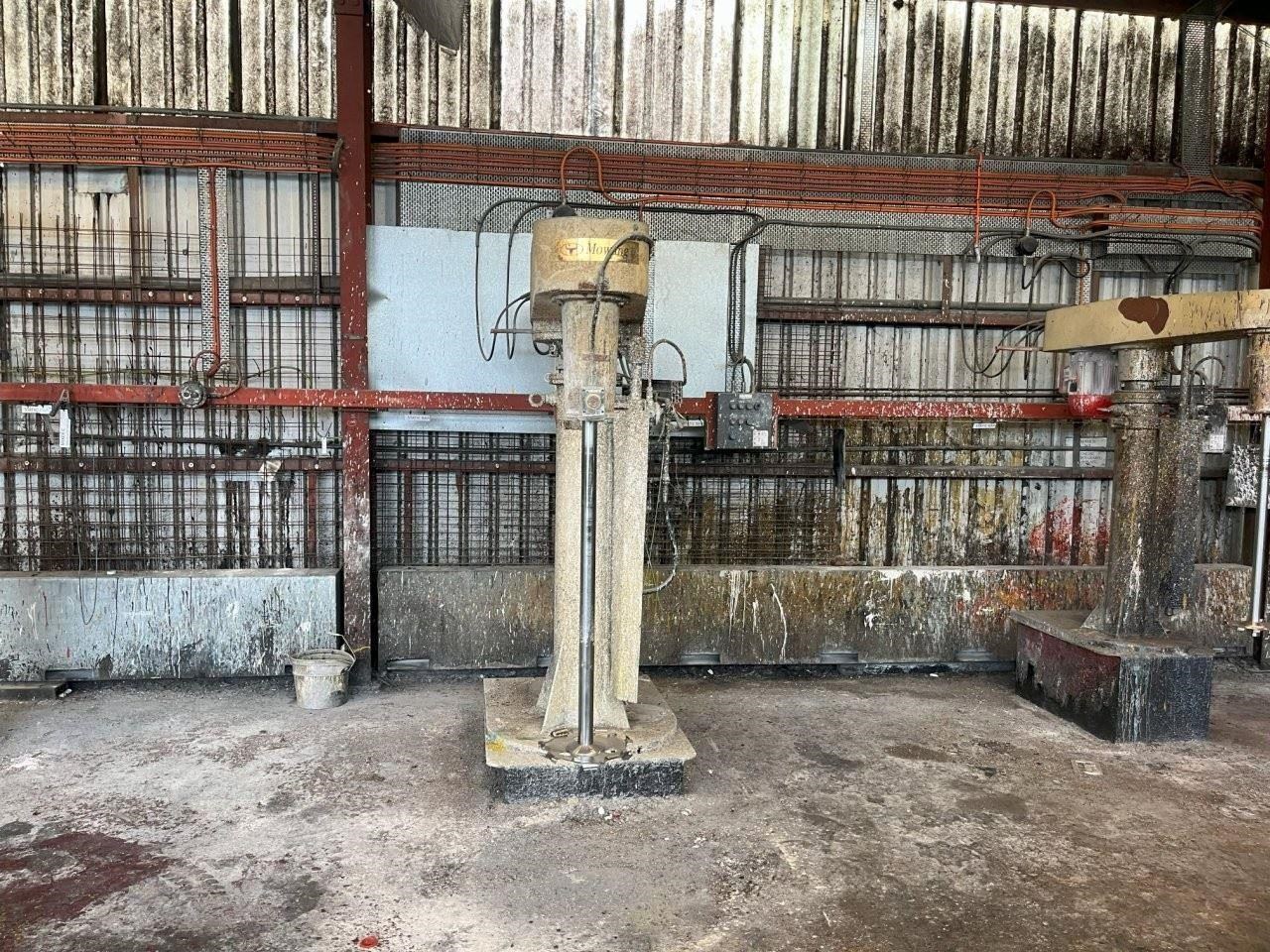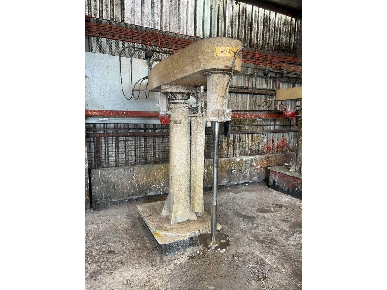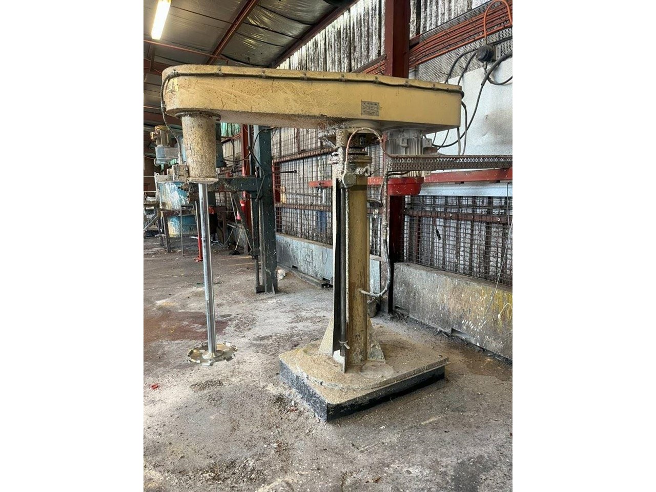 MOWANG - High Speed Disperser. (Ex. Rated) Model: F-L22 Power: 3 Phase, 415V, 15kW (main motor), 1.5kW (pump motor) Speed: 1200 RPM Dispersion Blade Dia: 350mm Lifting Height: 1200mm Disperser mounted to a 200mm riser. Disperser complete with controls, elecrical cabinet and a hydraulic power pack for lifting blade. Both main motor and hydraulic motors are Ex rated. 1 Unit available. Dispersers were removed from an ink manufacturer. Units to be run and tested. Mutiple paint pots also available for purchase ranging from 300 - 1000 Litres