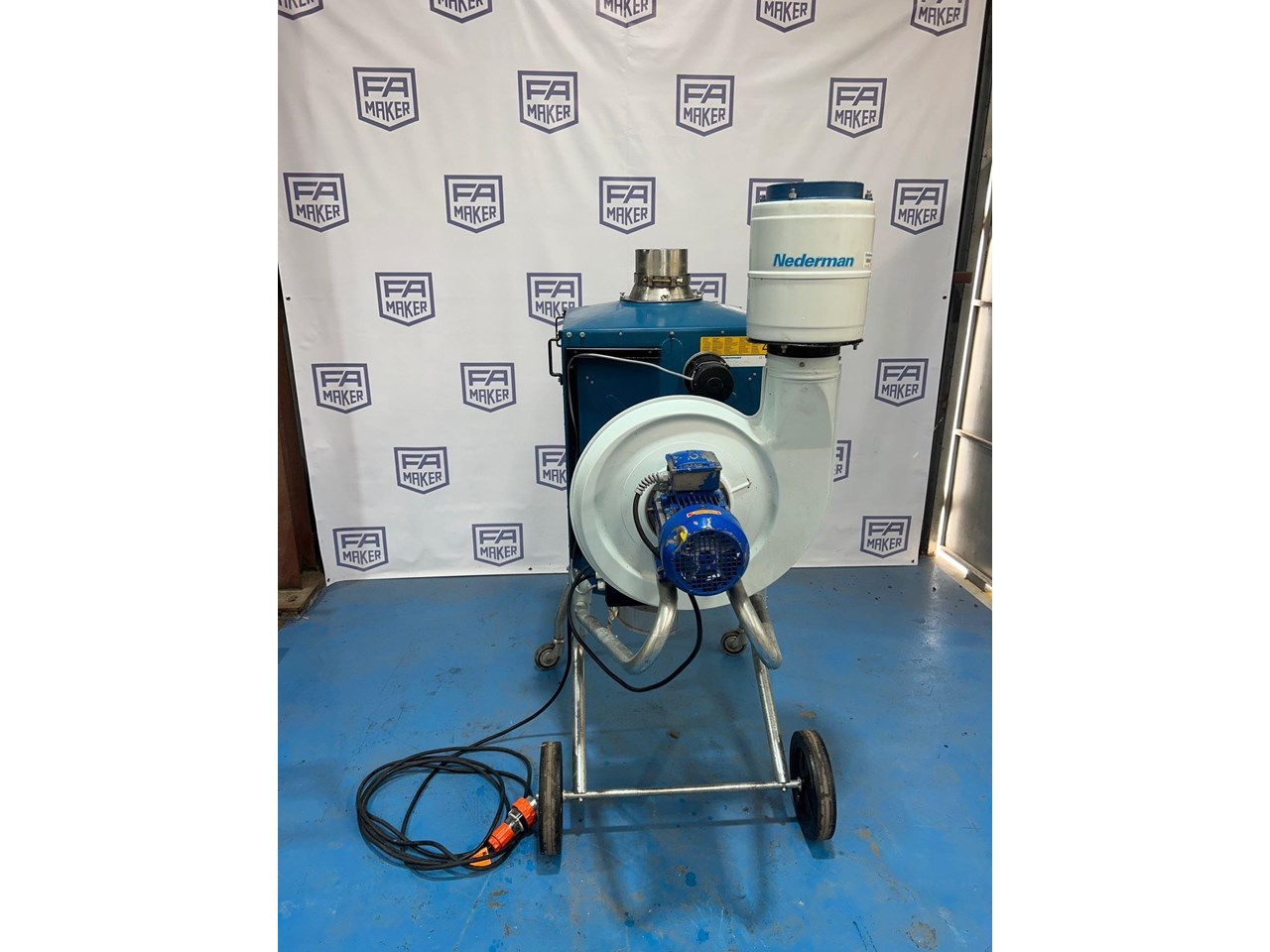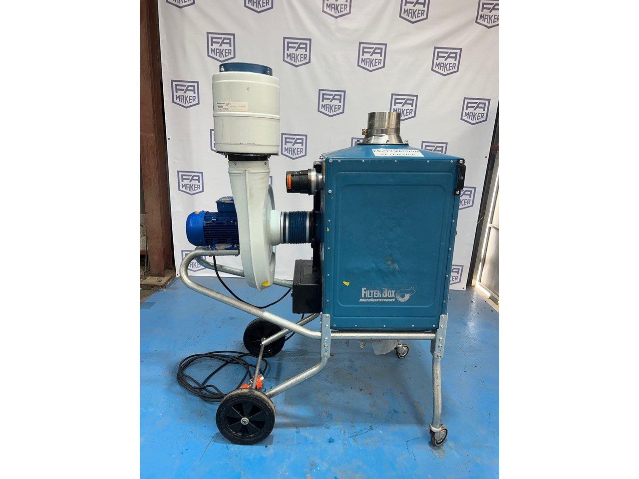 Nederman Filterbox - Portable Dust or Fume Filter YOM: 2004 2.2kw, 415V, 4.3amps Approx 700CFM Fitted with an exhaust silencer The Filterbox offers a powerful and efficient solution for capturing dust and fumes directly at the source. Designed for versatility and cost efficiency, it adapts to a wide range of applications. Dirty air is sucted in the top (requires ducting for the inlet) it has a mechanical filter cleaning cycle that drops to dirt particles into a bin undeneath. Portable and easy to move around. Runs well.
