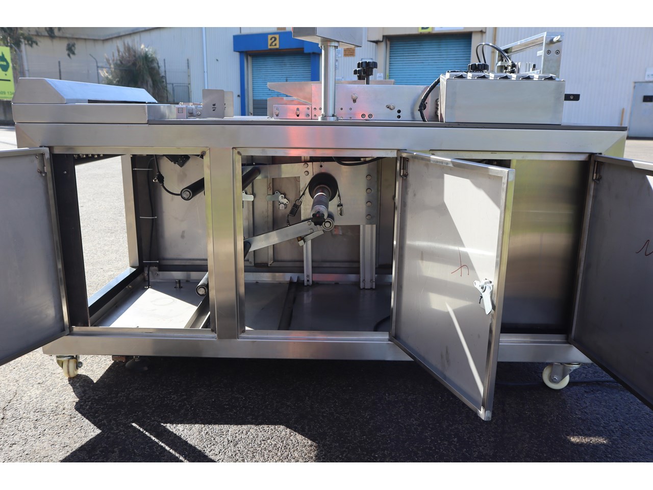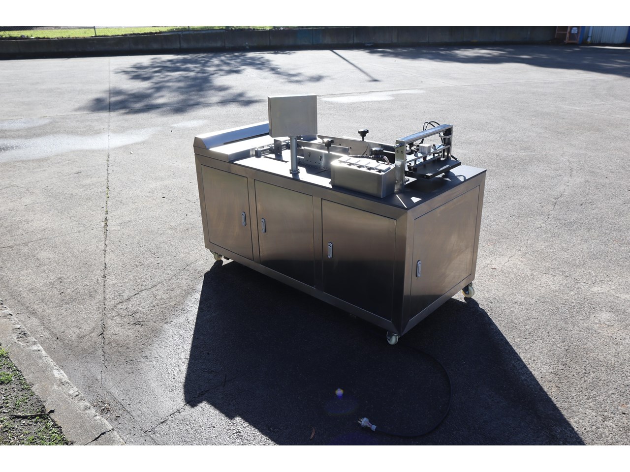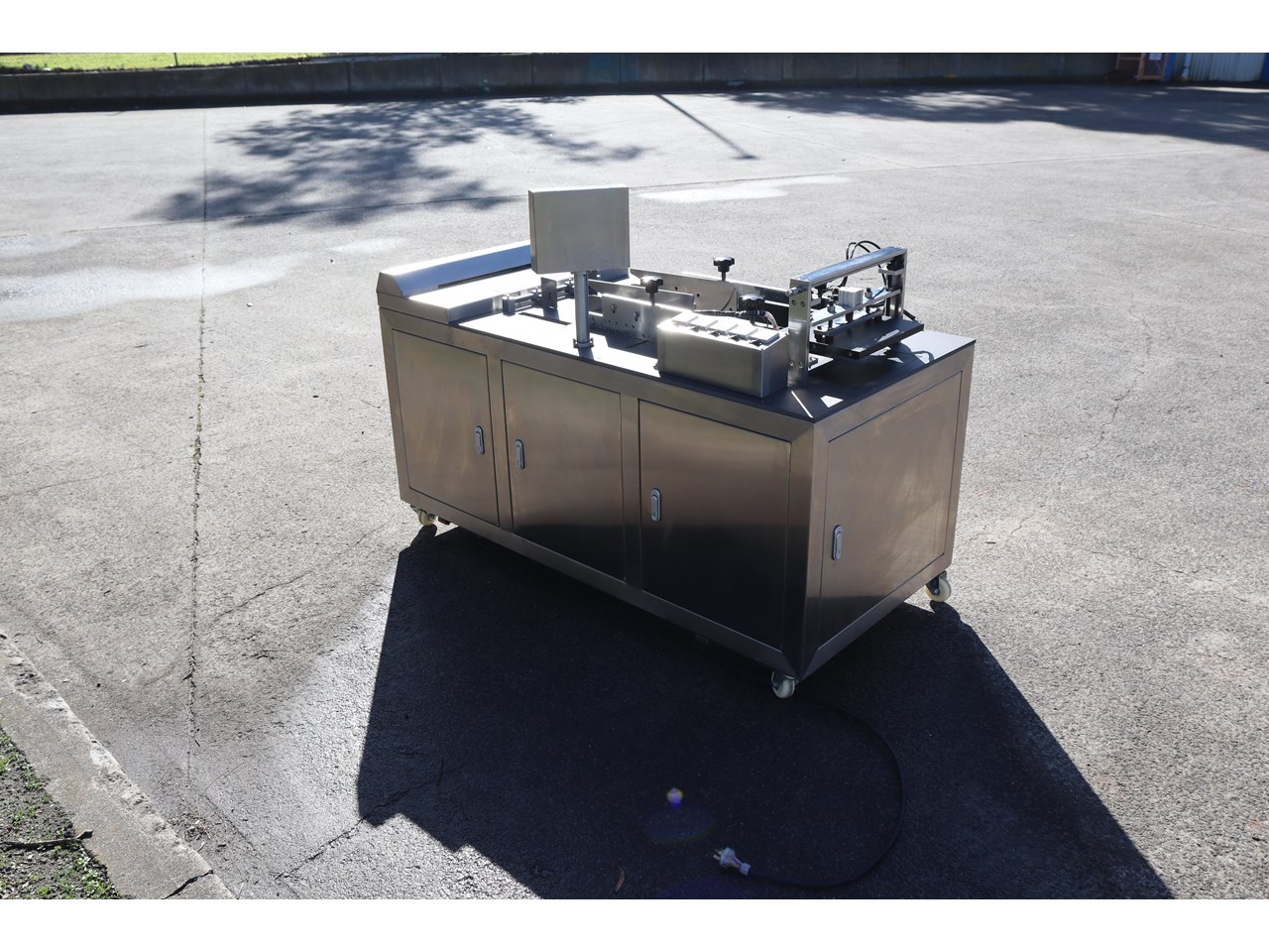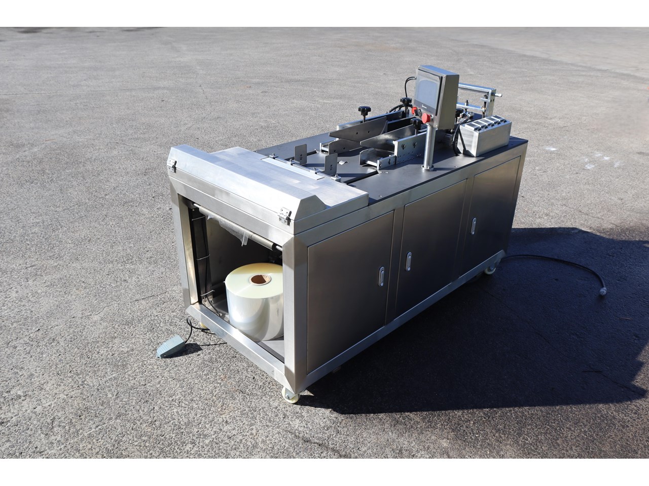 Compact wrapping unit for cellophane film/bi-axally orientated polypropylene(BOPP film). Suited to cosmetics, perfumes, tea, and small gift boxes. Adjustable temperature control and simple operation controls. Handles up to approximately 20 packs per minute.