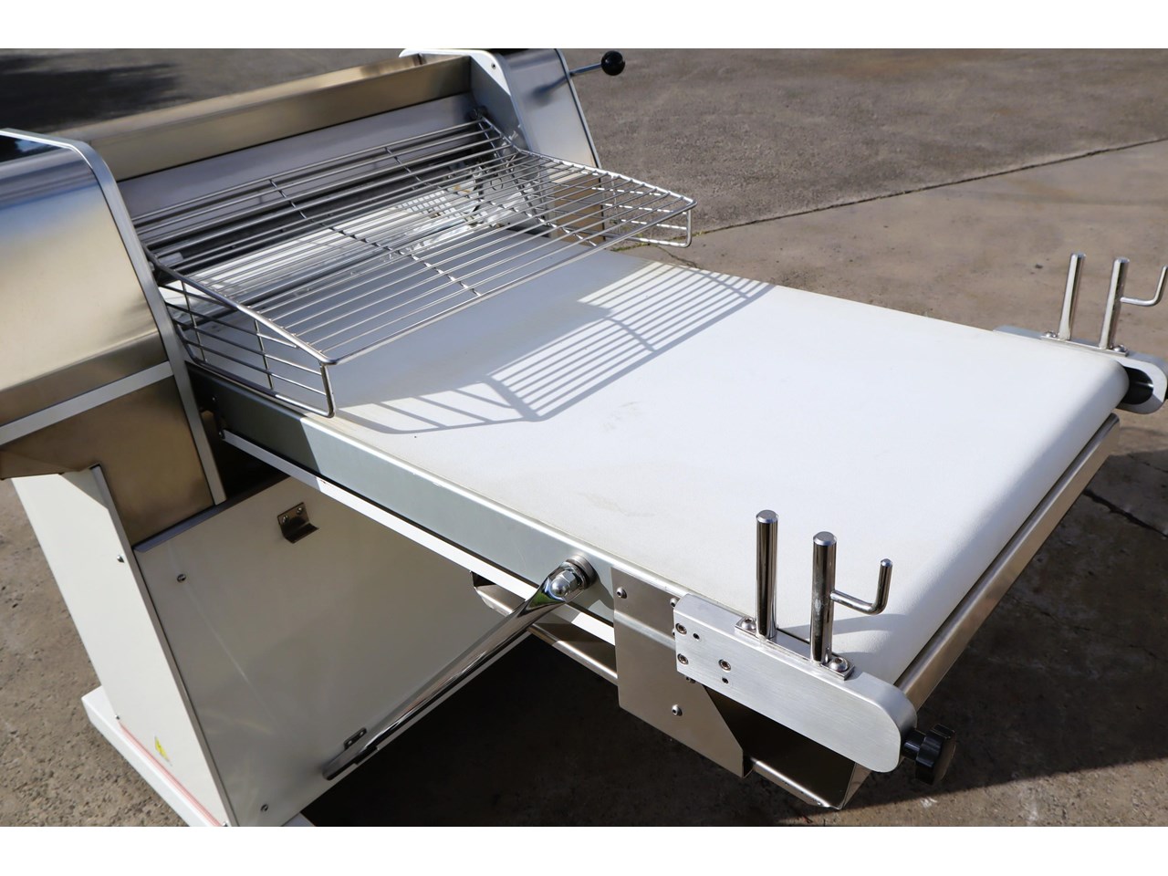 - Stainless steel safety grids, flour tray, and retractable support arms