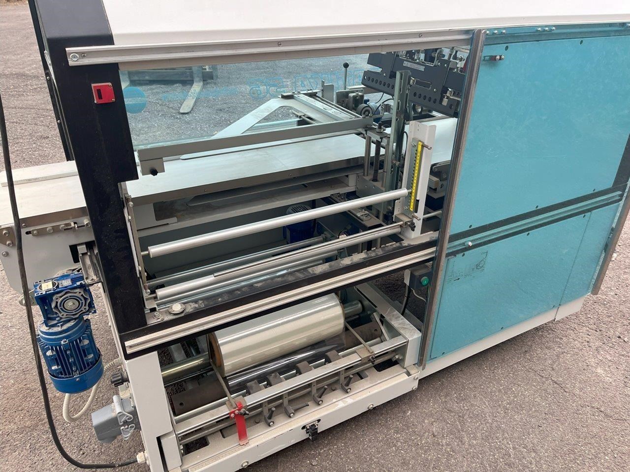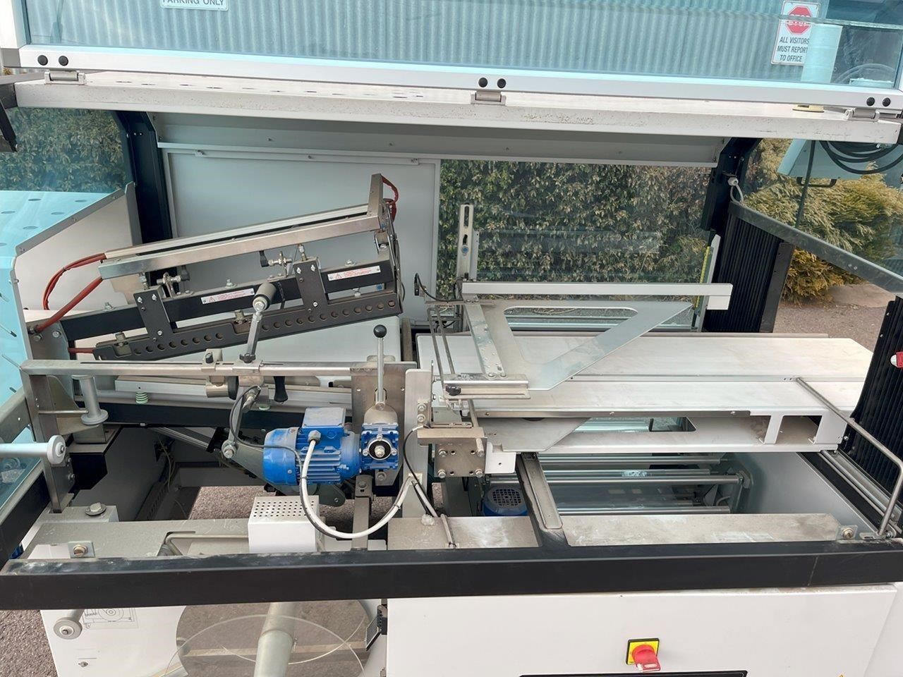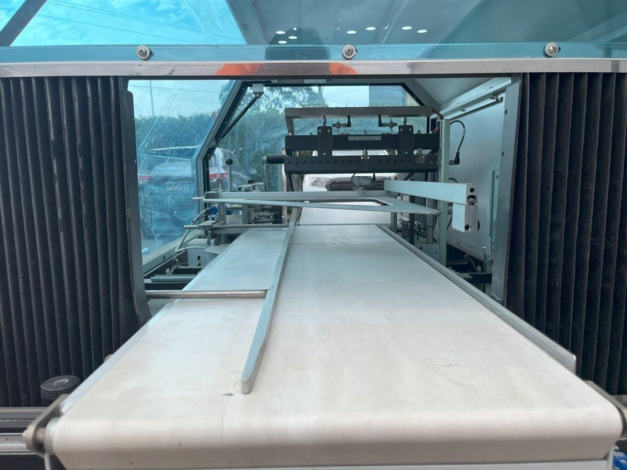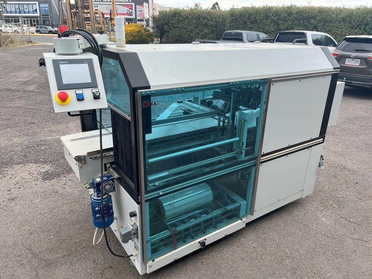 Minipack-Torre automatic heat shrink packaging machine with a L-Bar sealer. This machine will feed your product on the infeed conveyor and enclose it into the film wrap. The L-Bar sealer seals the film wrap, and the outfeed conveyor removes the now enclosed product out of the machine. In a typical setup a heat shrink tunnel will be placed on the outfeed, and the products film wrap will shrink/mould to fit tight around the product. Single Phase 240V. Automatic or manual modes. L-Bar sealer. Easy to adjust for desired width and height. Max product dimensions: 600mm x 400mm x 160mm High. Year: 2014 Unit in excellent condition.