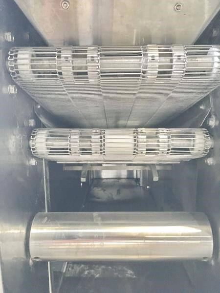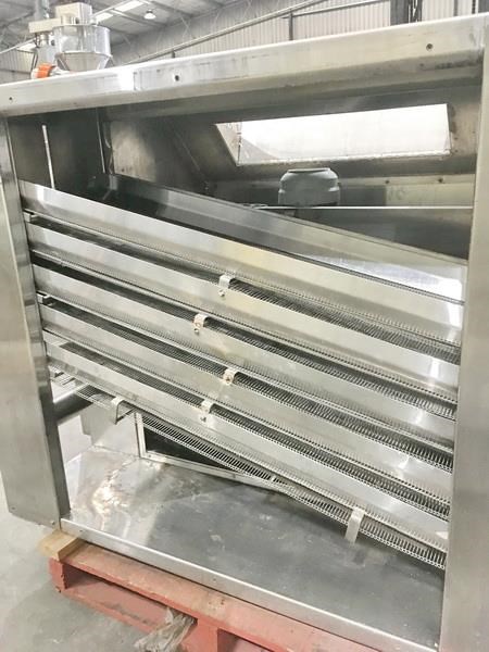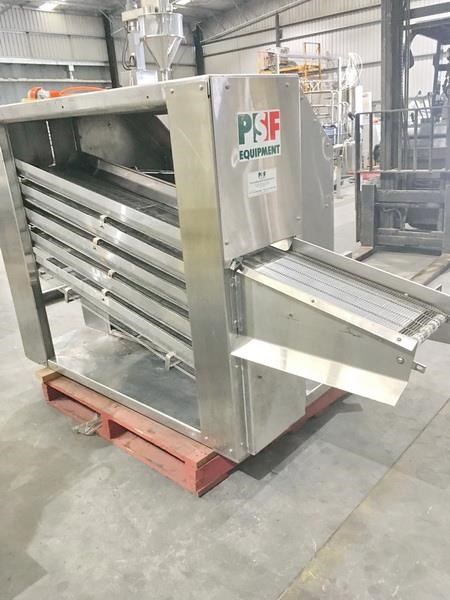 SS Belt Dryer Food grade 300 wide S/S wire belt (10mm gap) 5 tier ( approx 7.5m of conveyor). Thermostat control 50c. Electric Elements with fan force heating. Made by George Courtier Engineering Brisbane. Trade name PSF equipment
