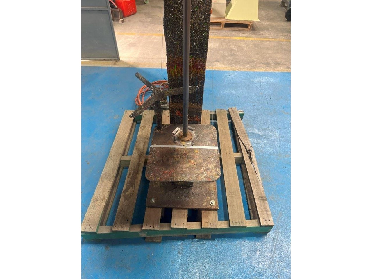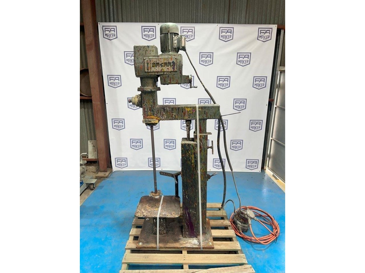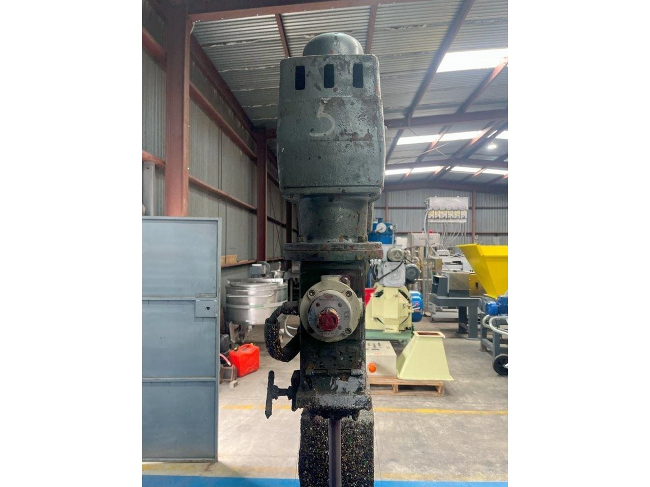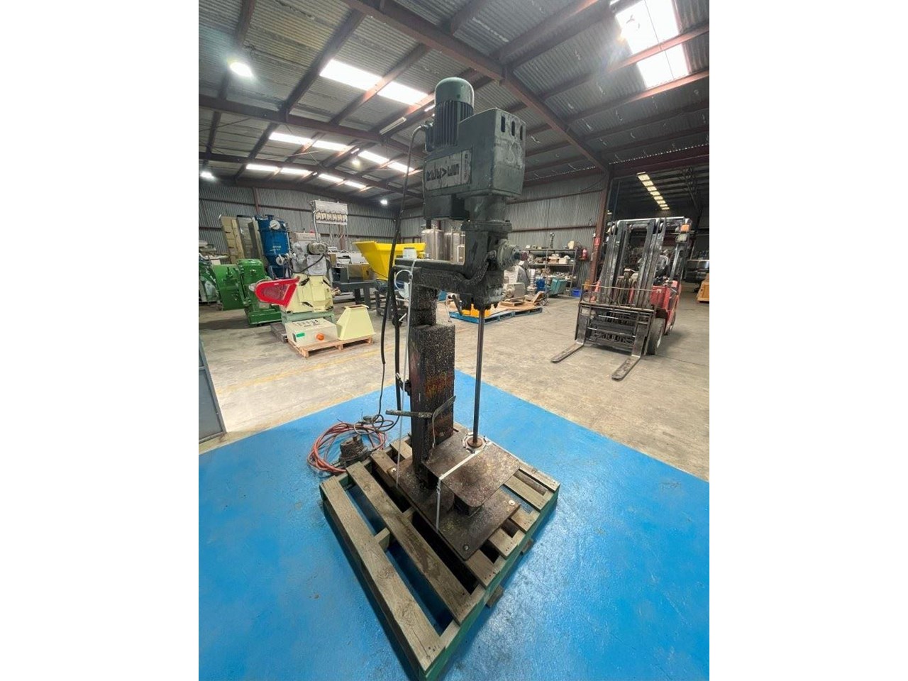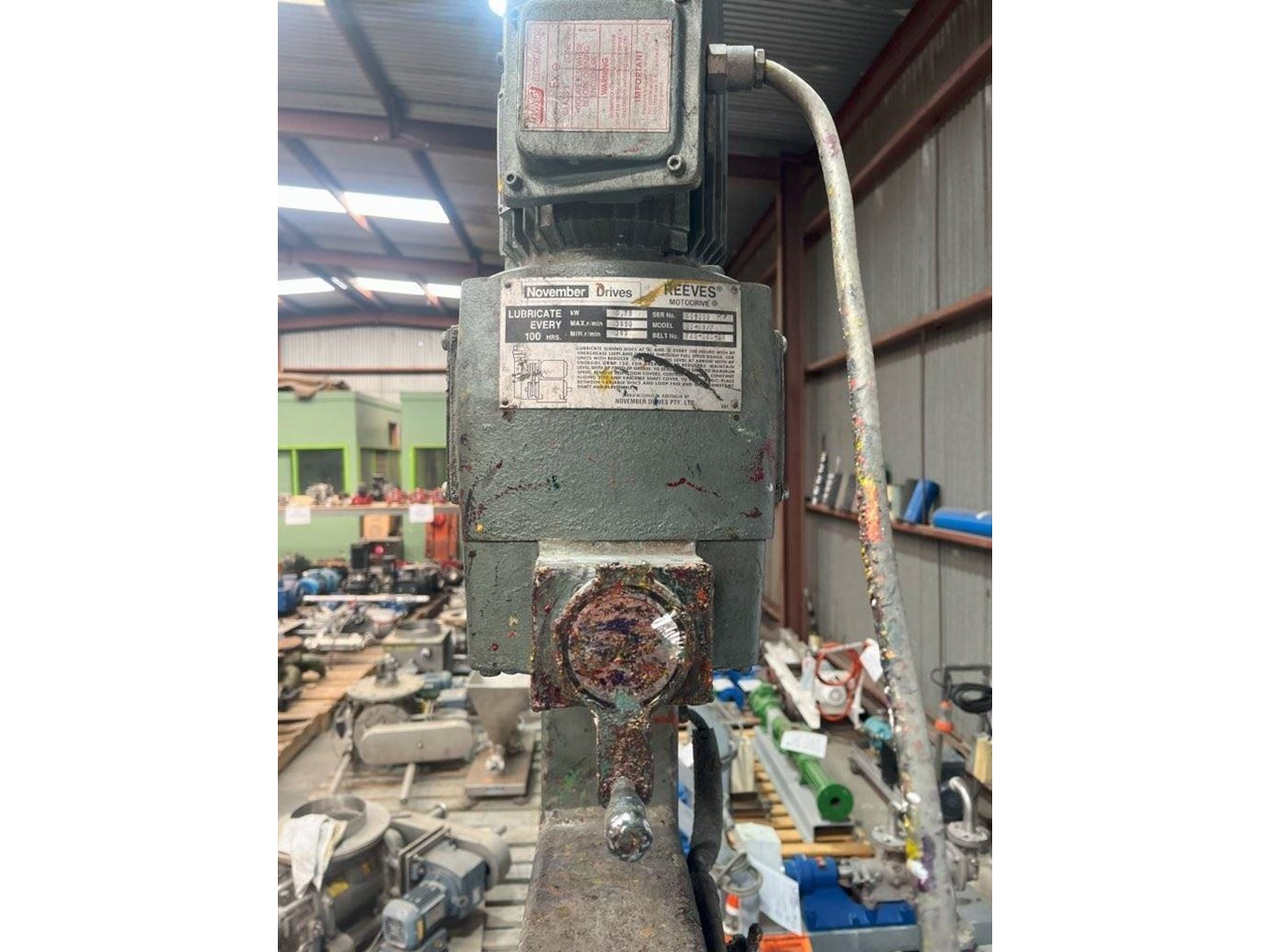 High Speed Disperser. (Ex. Rated) Pneumatically raised and lowered. Reeves variable speed drive with Ex rated motor. Power: 3 Phase, 415V, 0.75kW Speed: 385 - 3850 RPM Dispersion Blade Dia: 150mm Lifting Height: 650mm Shaft Length: 730mm Platform Dims: 400mm x 430mm Platform has a backstop for paint pot to be secured to. Disperser complete with Ex. starter controls and E-stop. 1 Unit available. Disperser was removed from an ink manufacturer. Unit runs well and raises and lowers nicely.