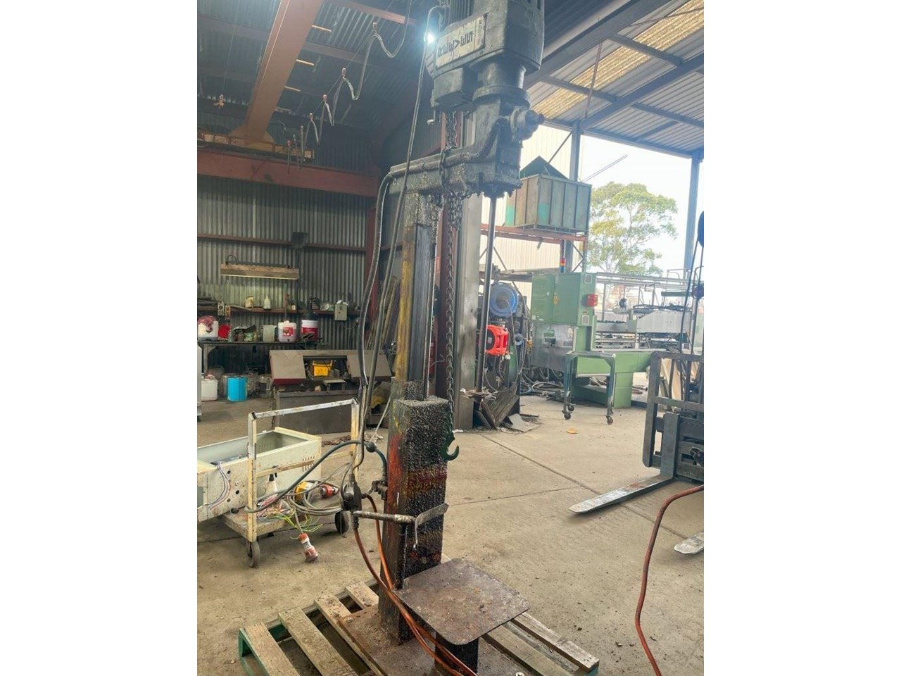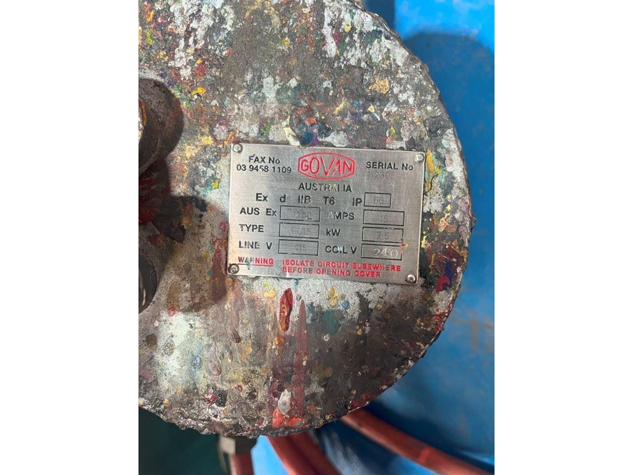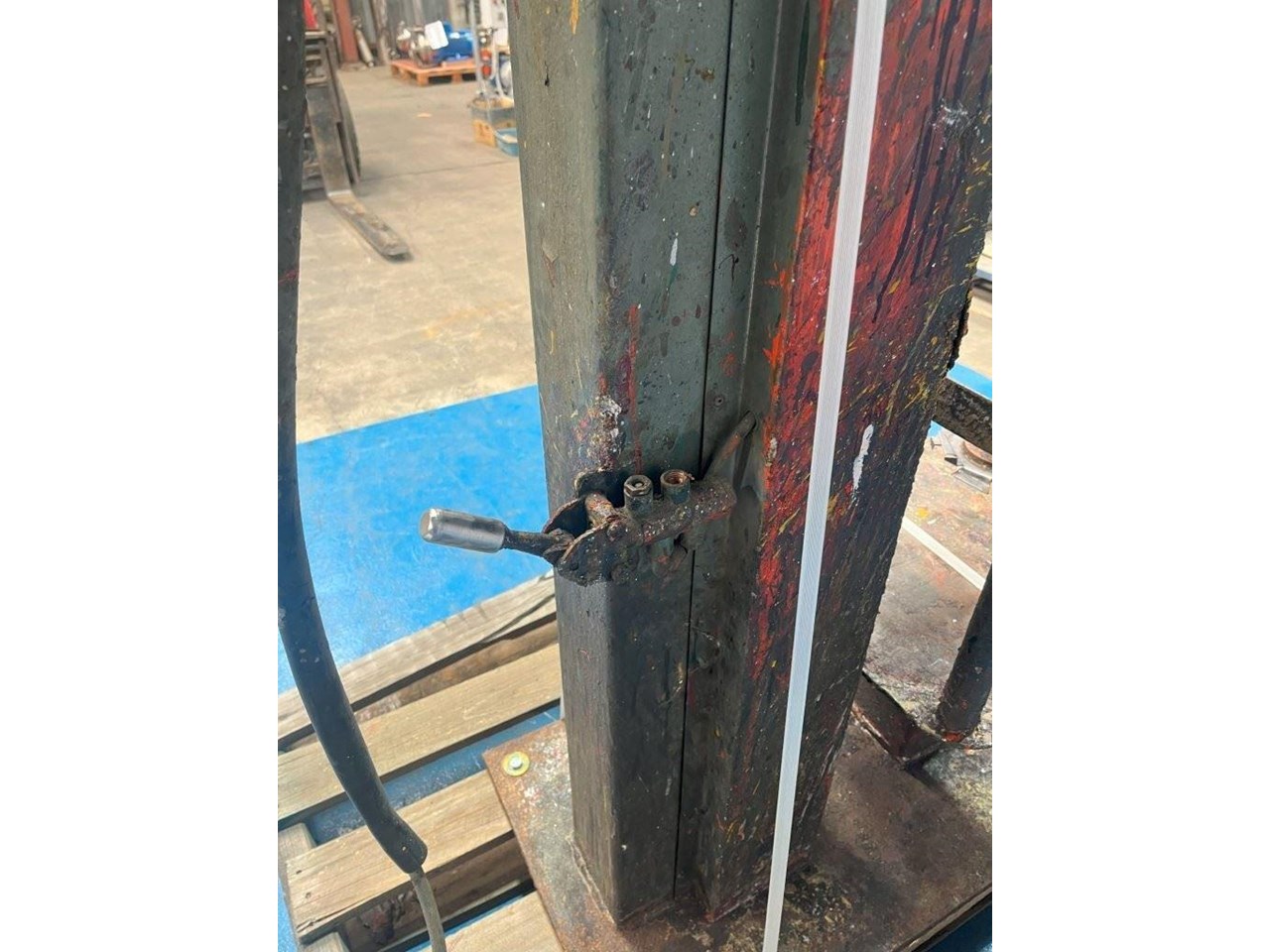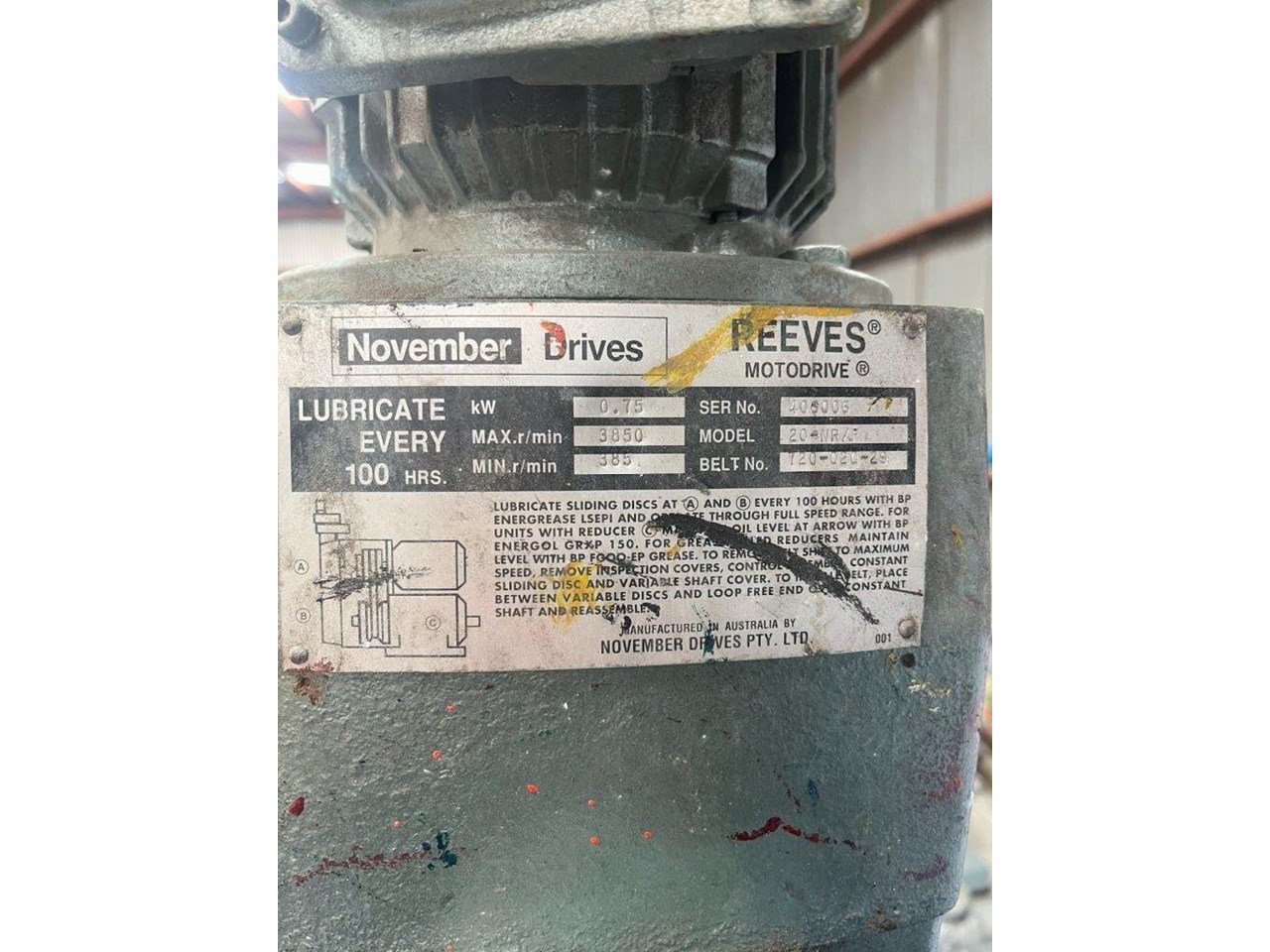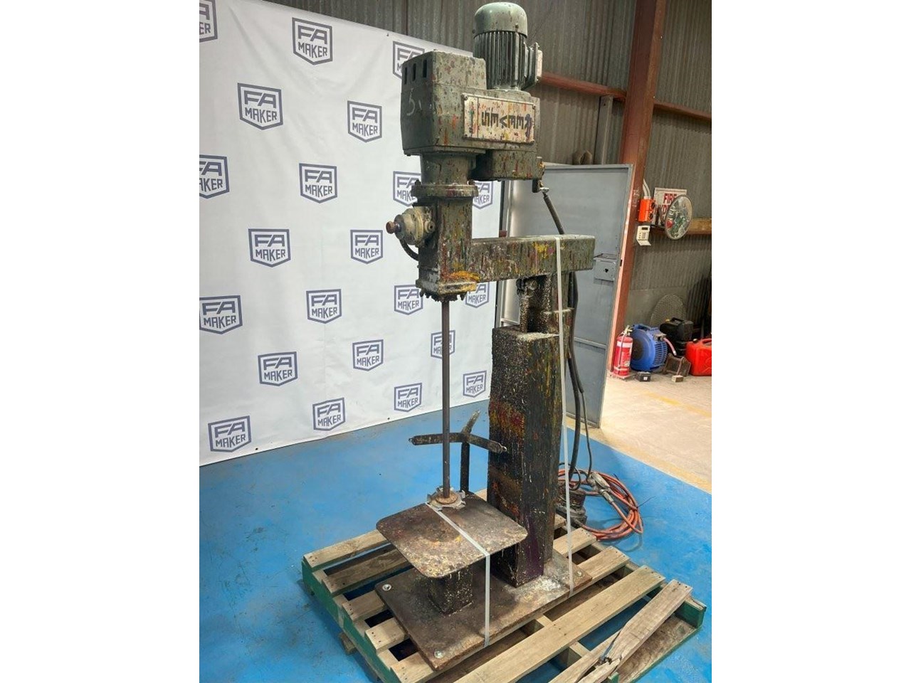 High Speed Disperser. (Ex. Rated) Pneumatically raised and lowered. Reeves variable speed drive with Ex rated motor. Power: 3 Phase, 415V, 0.75kW Speed: 385 - 3850 RPM Dispersion Blade Dia: 150mm Lifting Height: 650mm Shaft Length: 730mm Platform Dims: 400mm x 430mm Platform has a backstop for paint pot to be secured to. Disperser complete with Ex. starter controls and E-stop. 1 Unit available. Disperser was removed from an ink manufacturer. Unit runs well and raises and lowers nicely.