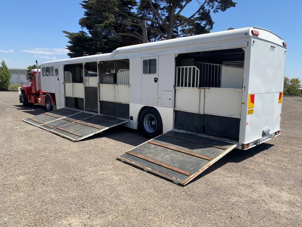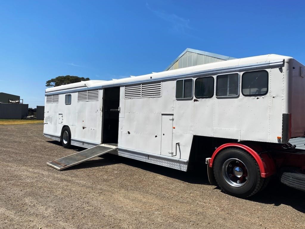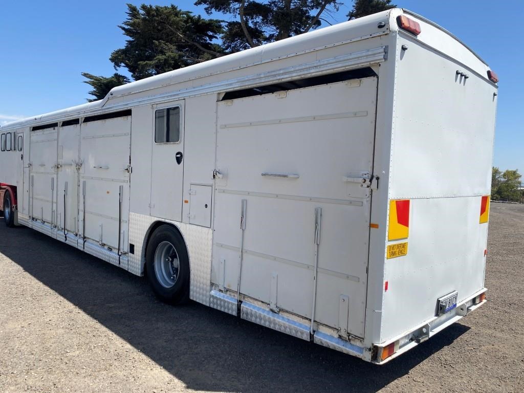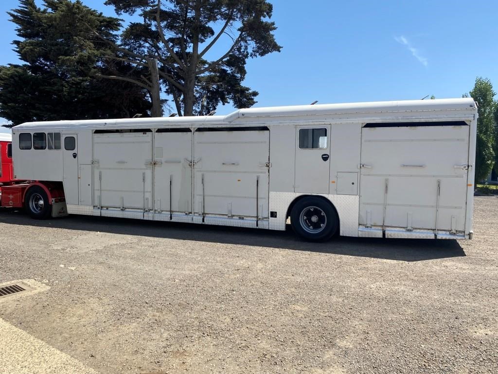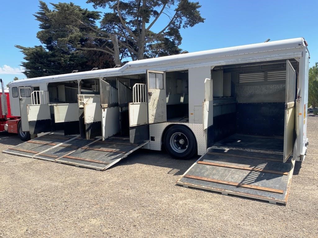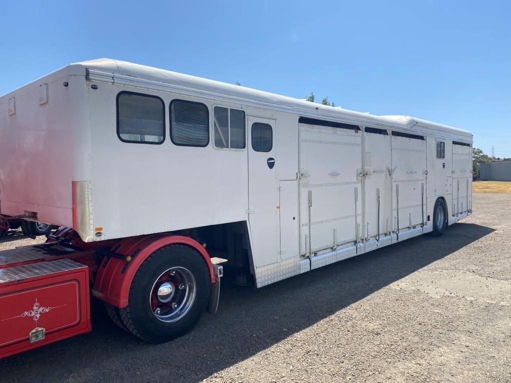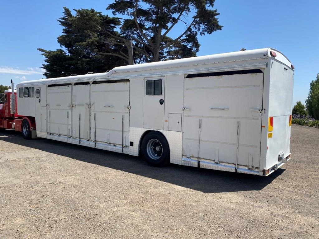 Semi Trailer 10 horse float with sliding dividers, 12.5 Mtr overall length, built or (refurbed?) by Richards Coachworks in 2019, airbag suspension, LED lights, appears to be in generally good condition and needs a minor tidy up on the outside. All appears to work as it should, and tows well. $21000 + GST = $23100 Inc GST. Located in Geelong Victoria