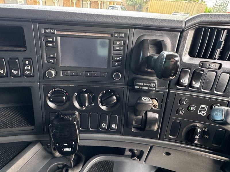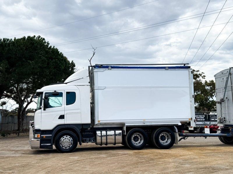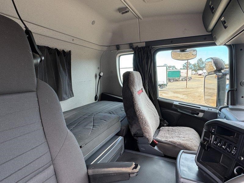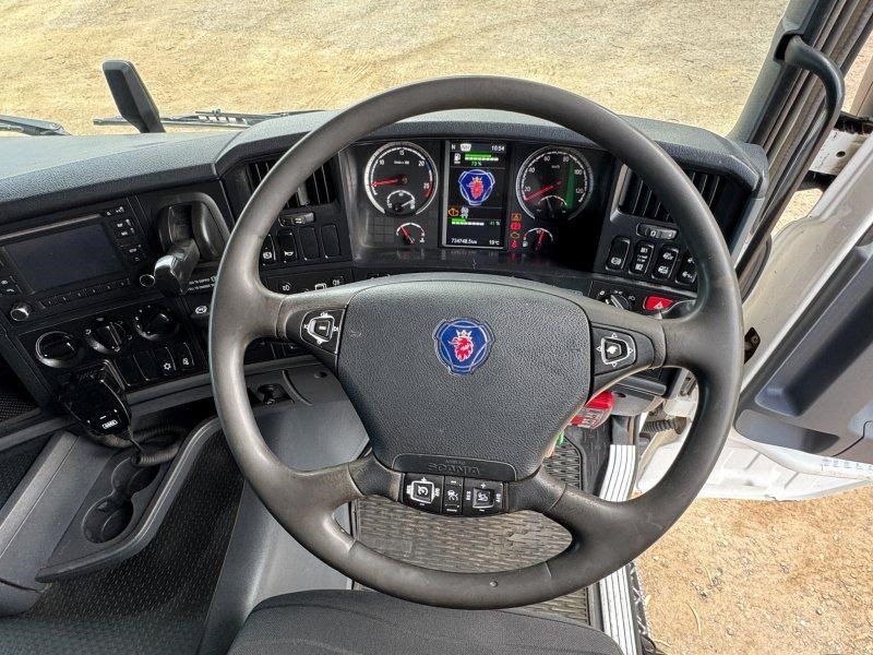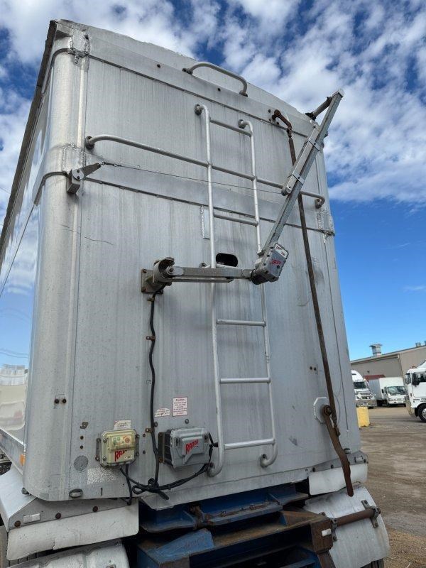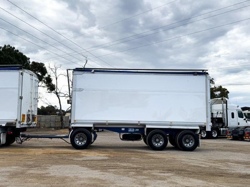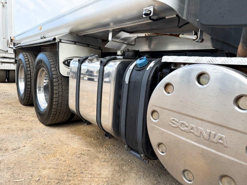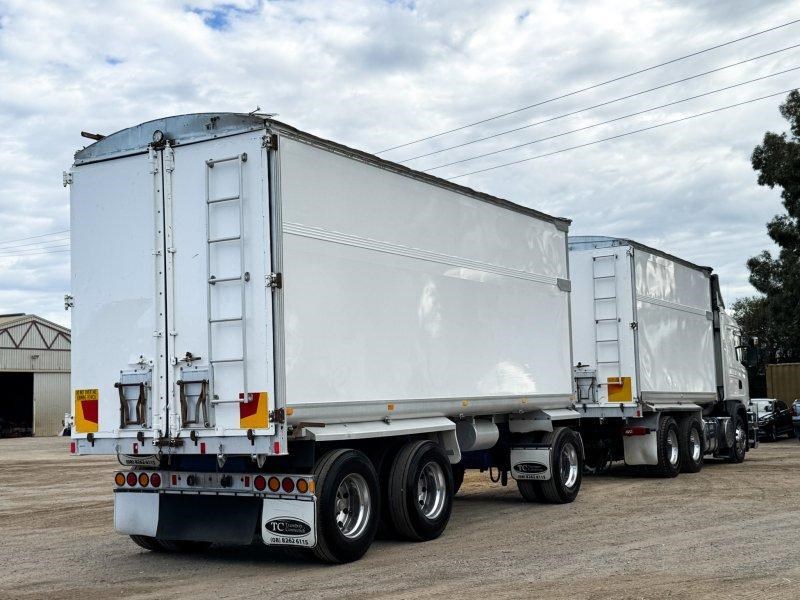 Combination Scania G480 tipper and Stoodley super dog, both fitted with high side alloy bodies, electric tarps, and grain chutes. Ready for bulk haulage or agricultural work.