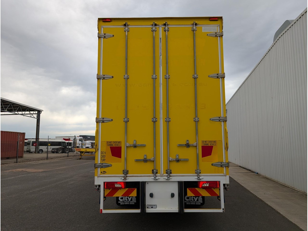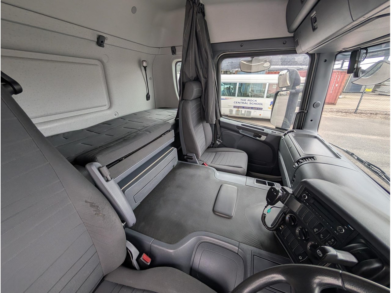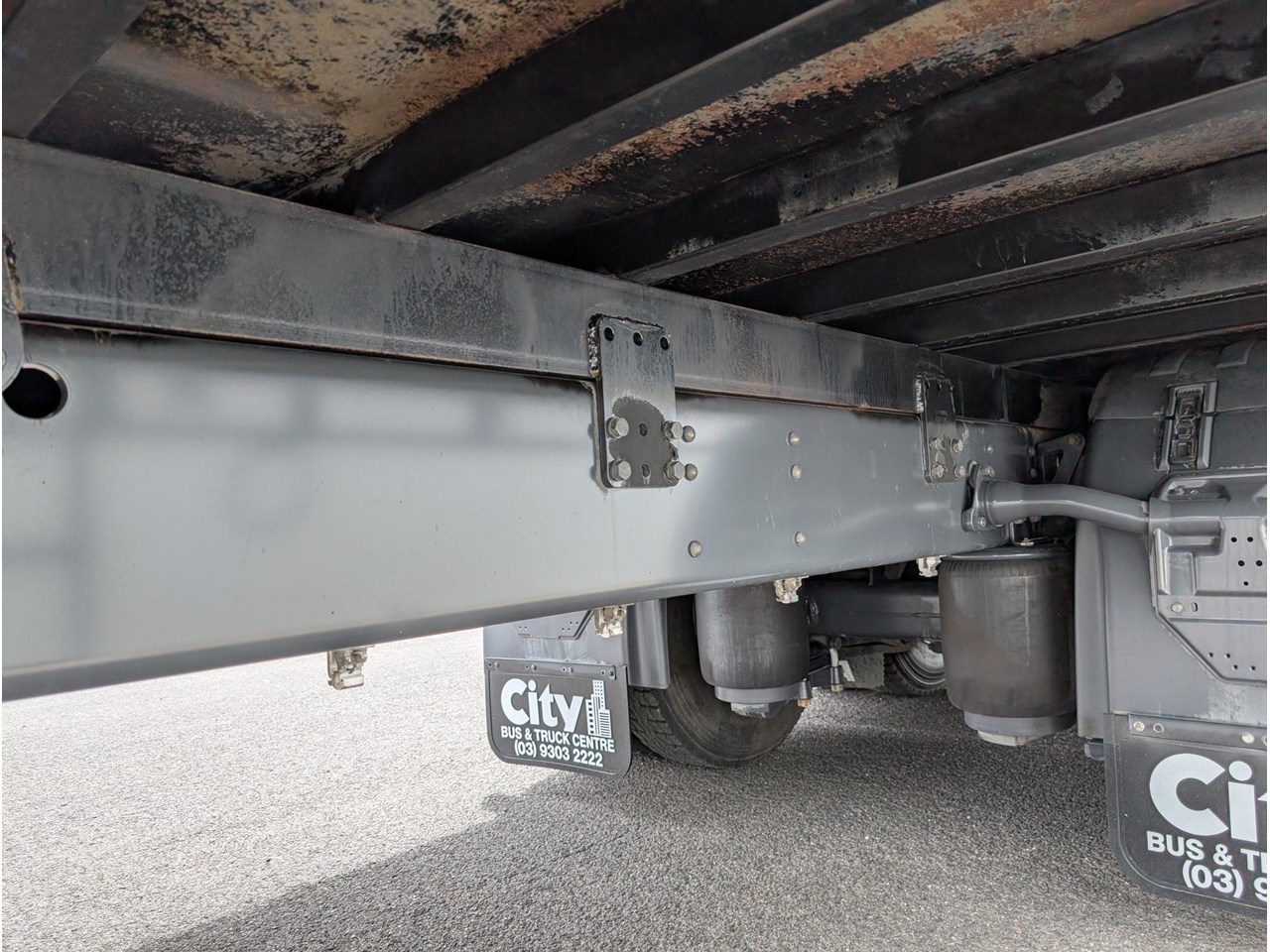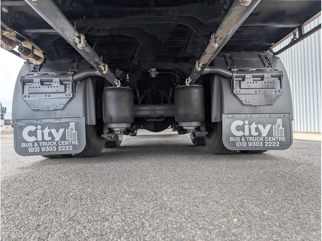 Sleeper Cab, 320HP 5 Cyl 9.2Ltr Turbo Intercooled Diesel, 12 Speed Opticruise Automatic, Exhaust Brake, GVM: 26,500kg, Lazy Axle on Airbag Suspension with Raise / Lower Control, Axle Lock, ABS Brakes, Air Drivers Suspension Seat with Lumbar Control & Integrated Boom Mic, Power Steering, Cruise Control, Tilt/Tele Steer Column, Power Windows, Electric & Heated Mirrors, Air Conditioning, Integrated Bunk Fridge, CD/Tuner Infotainment Unit with Bluetooth Connectivity, GME TX4500 UHF Radio, f/w 14 Pallet Austruck Jumbo Curtainsider Body (Internal Measurements 8.71m L x 2.91m H), Steel Chequerplate Floor, Raised Edge Coaming with 1,200mm Centre Gate Pockets, 1 x 3.64m L Mezzanine Deck in Front Half with Provision for 2nd Mezzanine in Rear Half, Load Restraint Curtains, Roof Mounted Sliding Load Retraints, Load Binders in Tracks, Internal LED Worklight, Front & Rear Curtain Tensioners & Ladders, Rear Barn Doors with Double Cam Locks, Nose Cone, Dual Fuel Tanks, Passenger Side Mounted Toolbox, 295/80R22.5 & 11R22.5 Tyres on 10 Stud Alcoa Alloy Rims & LED Lights.
