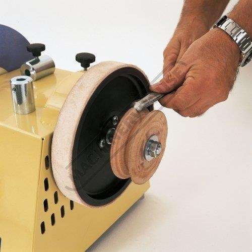 This leather honing wheel bolts on to the side of the existing honing wheel and has a contoured surface especially designed for polishing the inside and outside edges of gouges and V-tools.