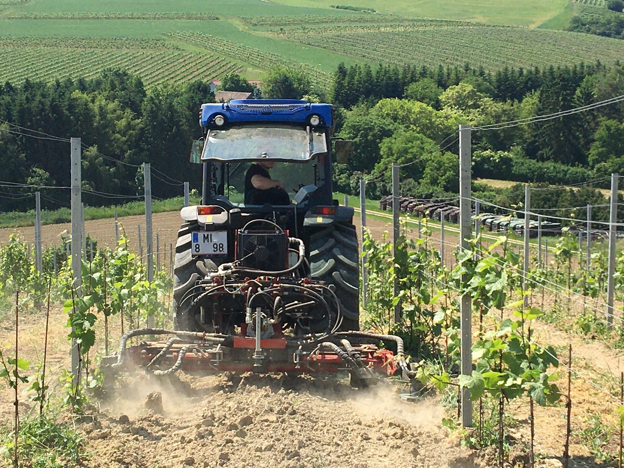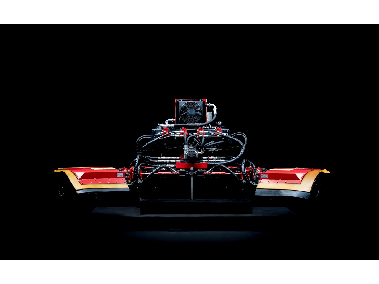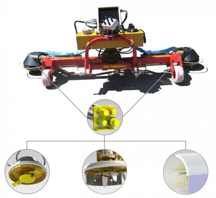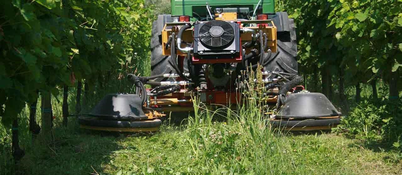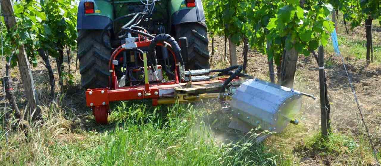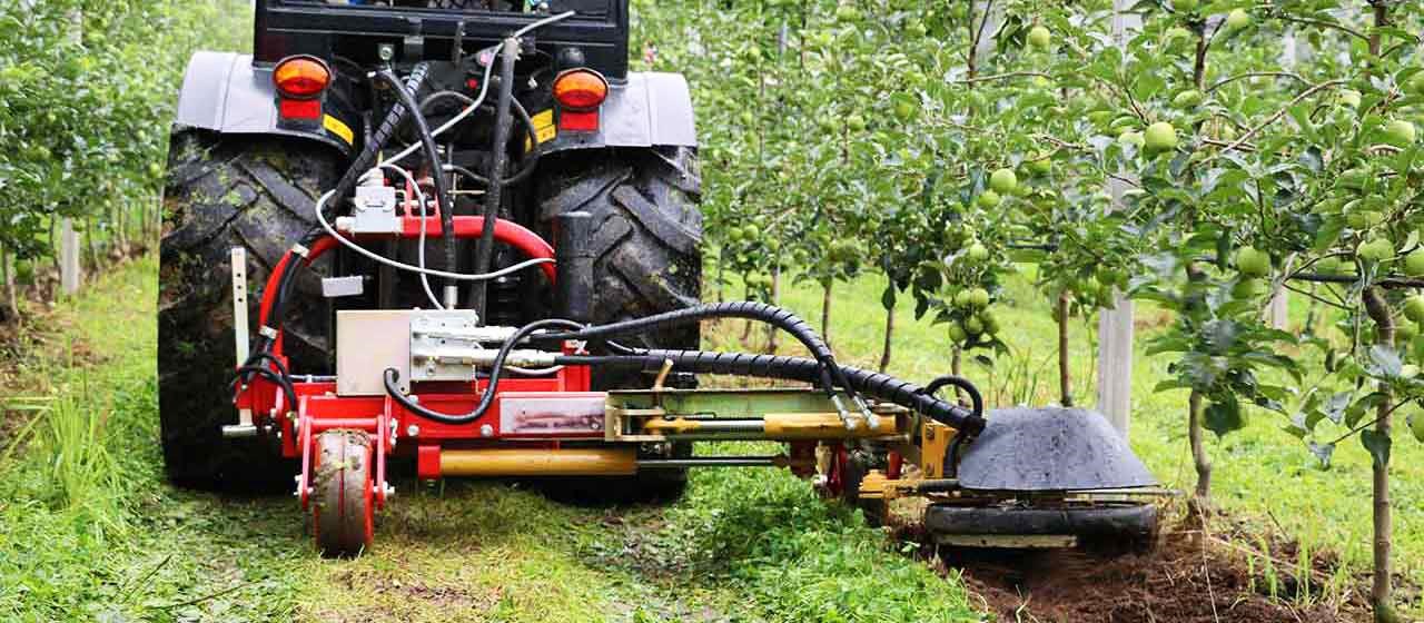 The carrier can be equipped with easy changeable accessory modules for under canopy maintenance. The hydraulic side shift allows a telescopic adjustment of the working outreach between the growing rows.