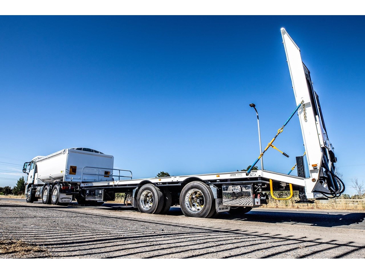 Complementing the rigid truck and tipper is a Jamieson flat deck tandem-axle pig trailer fitted with heavy-duty electric-operated loading ramps. This set up dramatically expands the versatility of the combination, allowing operators to transport machinery, pallets, construction materials, formwork, site equipment or oversized items alongside bulk loads.