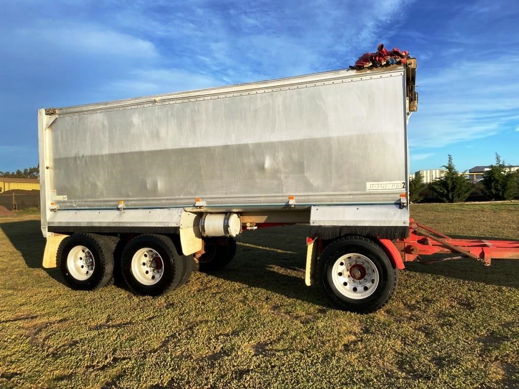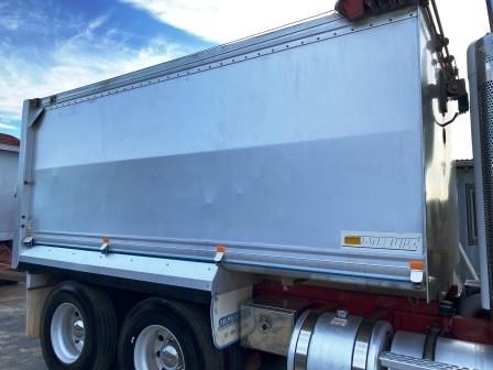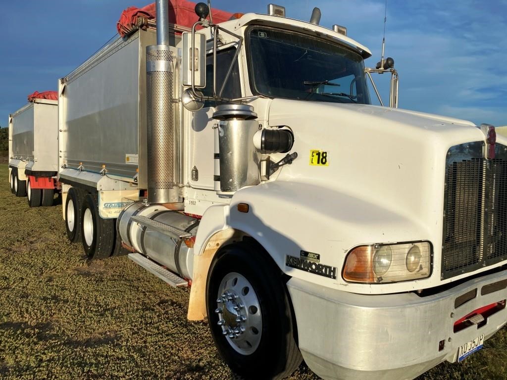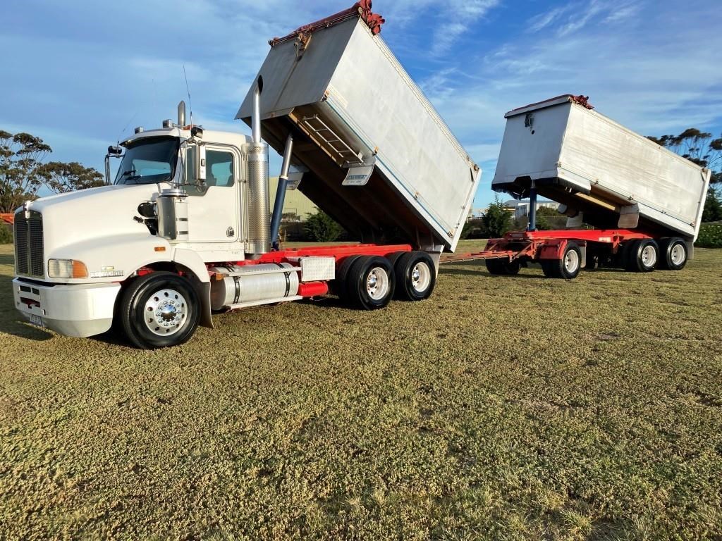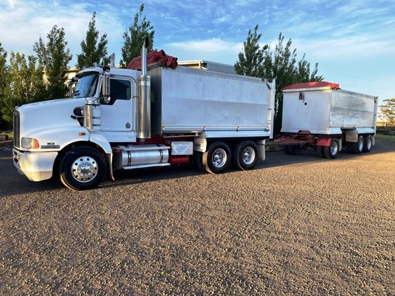 Kenworth T402 truck and dog combination- 04/2010, fitted with ISX 475 Cummins, Cobrashift auto, Rockwell diffs with full cross locks and power divider lock on 8 bag air suspension, runs and drives really well, cold air cond, and is quite straight and tidy. Fitted with Sloanbuilt alloy bin, and electric tarp, hoist and subframe are good, the bin floor is not flash, and really needs re lining, but will still do a job.