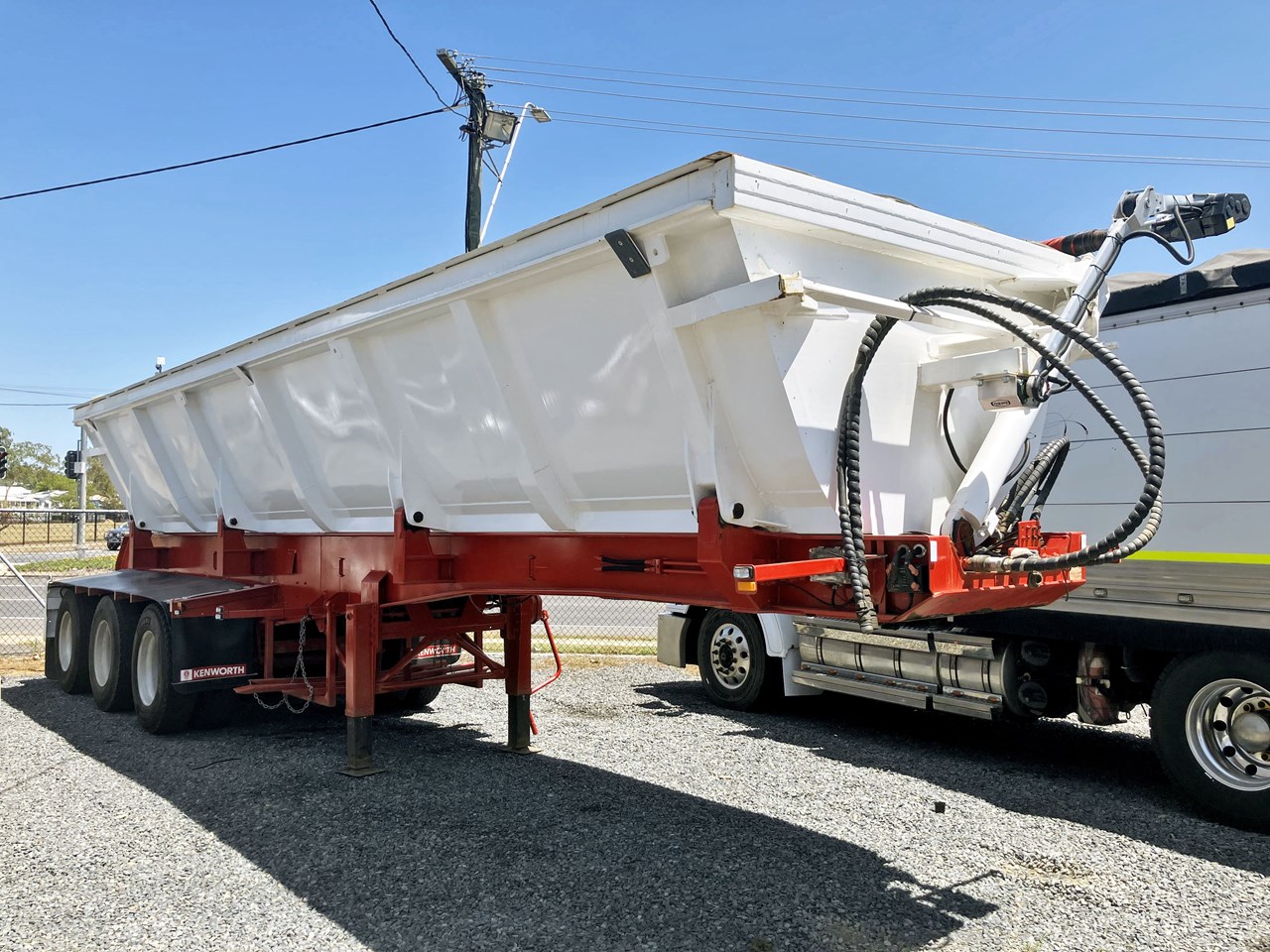 Stainless steel V bin design bin, road train specification, tidy order, K Hitch preset bearing axles, spring suspension, toolbox, water tank, electric roll tarp near new, 10 stud Aluminium wheels, Selling Price $62,000 plus GST= 68,200 incl gst