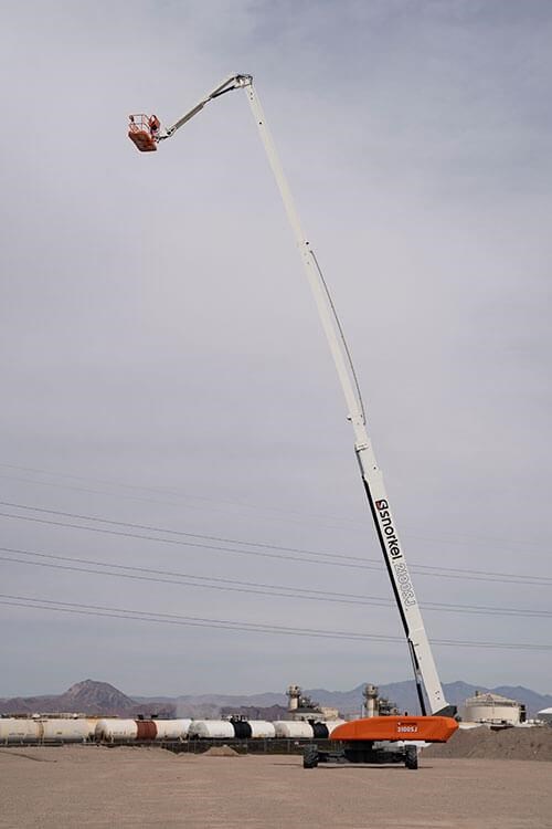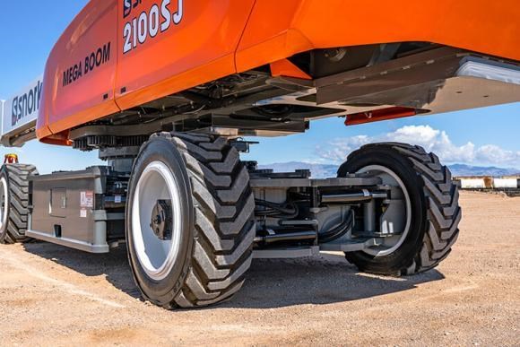 The Snorkel 2100SJ is Snorkel's largest diesel telescopic boom lift with patented design features. With an impressive reach and lift height, exceptional up and over capabilities offer a maximum horizontal reach up to 100 ft. (30.5m) with a 30 ft. (9.1m) jib boom. Two control panels on the platform allow for safe operation while working at height. Robust 4-wheel drive and multiple steering modes deliver superb rough terrain performance with a tight inside turning radius for excellent maneuverability. Its innovative wheel extension and narrow wheelbase provide stability on the job and ease of transportation.