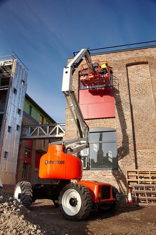 The Snorkel TB126J is the largest telescopic boom lift in the Snorkel product range. Designed to lift 227kg to a working height of 40.4m, it is equipped with a jib boom for added flexibility, high performance 4 wheel drive, a hydraulic powered extending rear axle and an envelope management system.