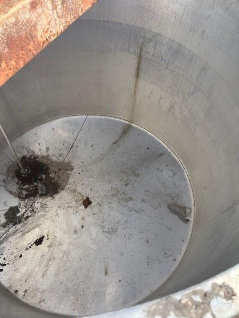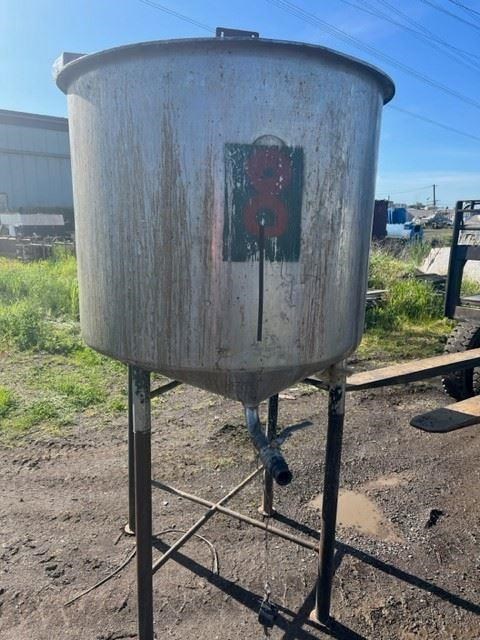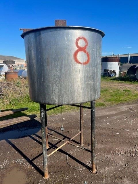 Stainless steel 900lt holding tank. Conical base to a 2 inch outlet. Open top. 1.2mt dia x 900mm straight side.