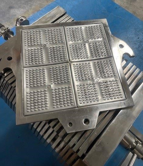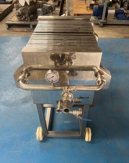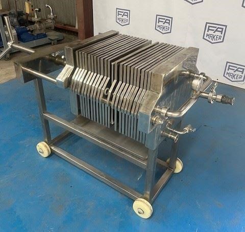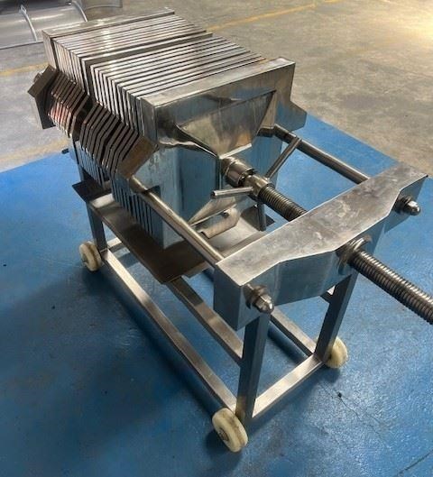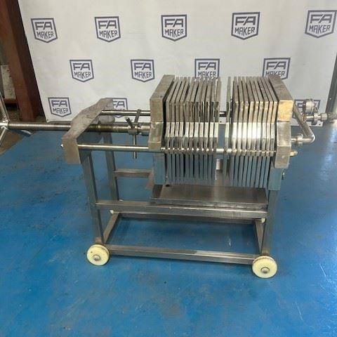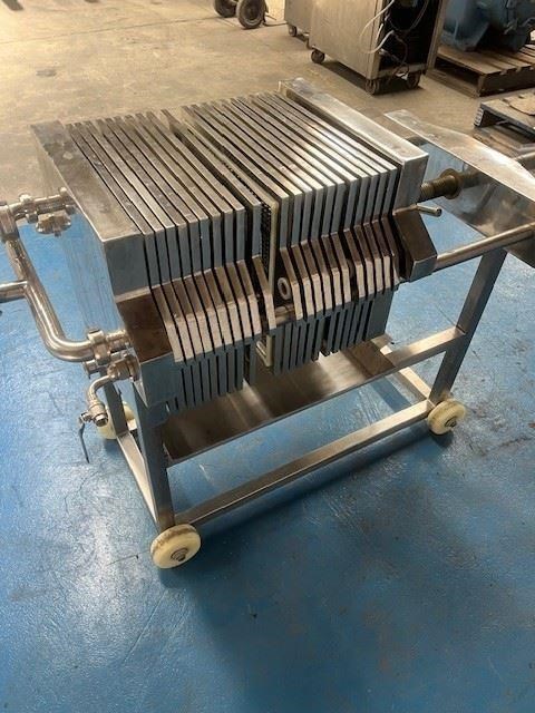 Stainless steel filter press. 21 plates 400 x 400 Plate and frame type. 1 inch inlet. Mounted on wheels. Requires feed pump. Last filtering hemp oil. Manual open and close. Some filter pads with