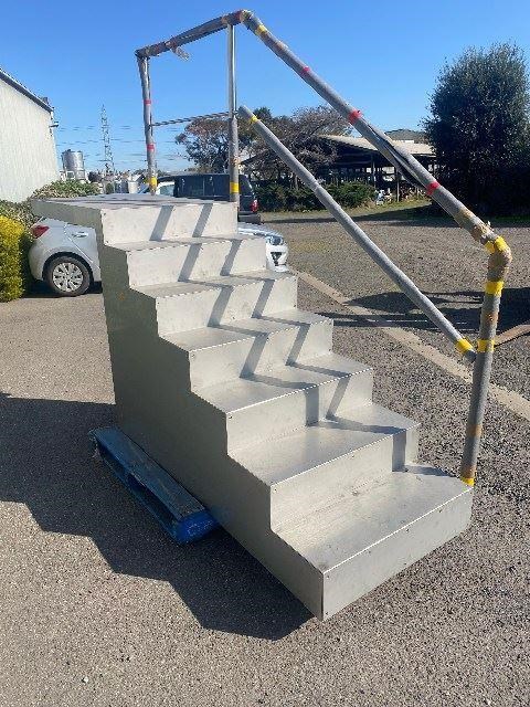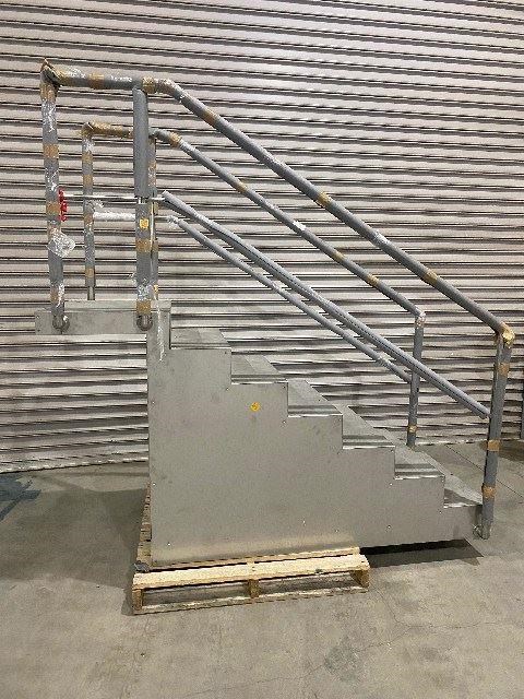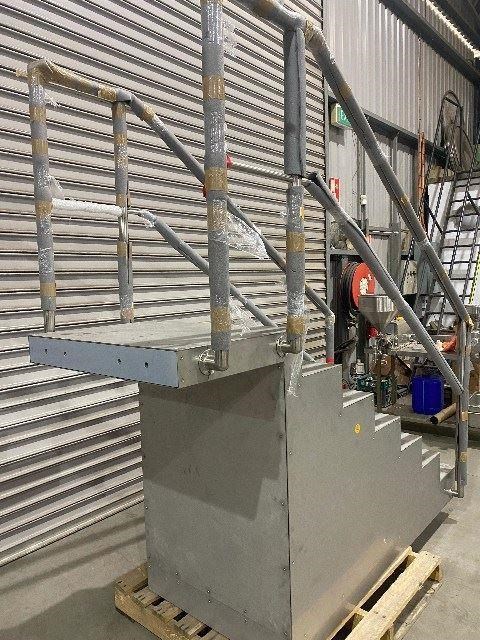 Stainless steel steps with platform. Ideal for a process plant .7 steps to platform. Steps 835 wide x 290 deep. Platform 600 x 835. 2 Hand Rails 1 meter high. 1280 floor to top Platform. Total length 2340mm 2 available, one has hand rail on one side only. 1400mm long platform on single hand rail set. price each