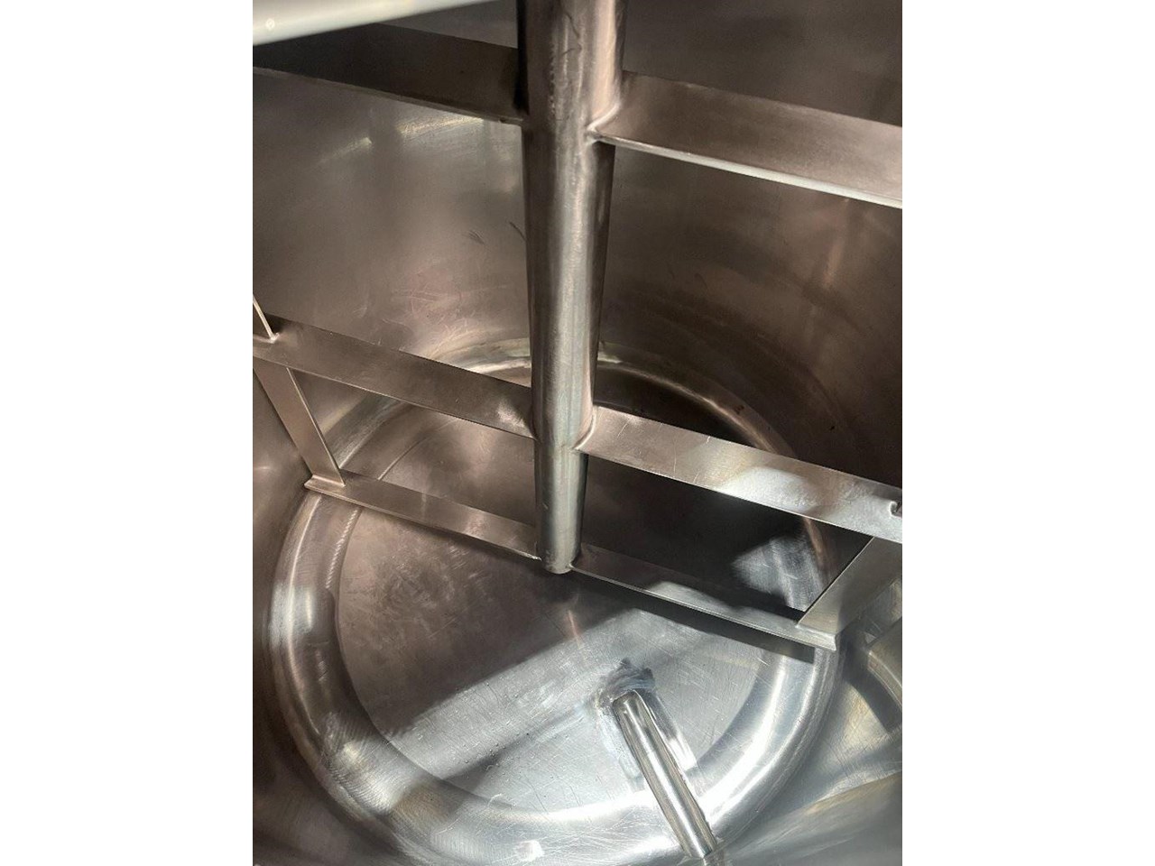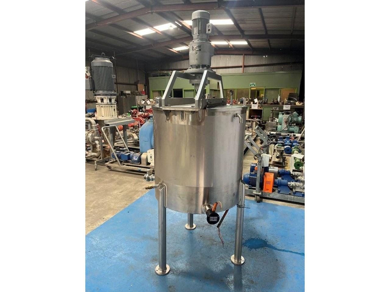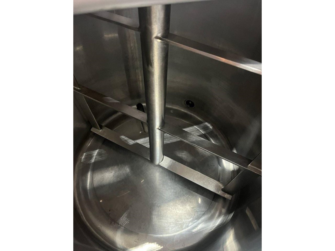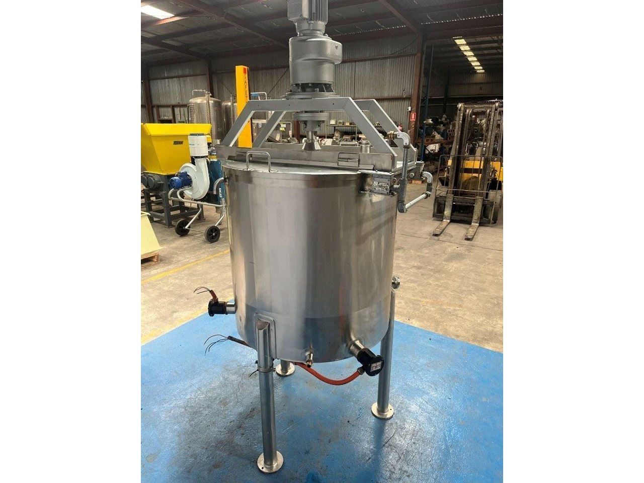 Jacketed mixing tank (stainless steel) with electric heating. 400 Litre volume. 3 Phase, 0.75kW, 415V gearmotor. Stainless steel mixing paddle. Speed: 17 RPM Flat bottom to a 1.5 inch outlet with a ss butterfly valve. 2 x hinged lids fitted with saftey switches. 2 inch top fill port. 2 x 1kW, 240V Helios heating elements. 1 x Teltru Thermometer. Overall height 2450mm. Mixer runs very well and heating elements work. (Temp controller required) Ex chocolate manufacturer.