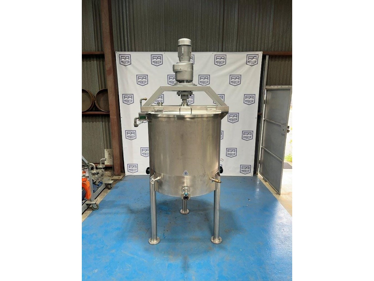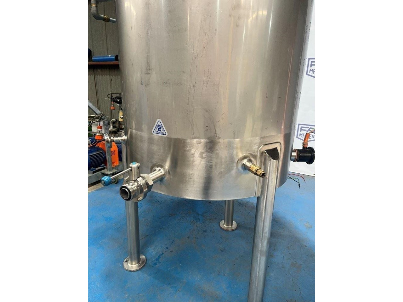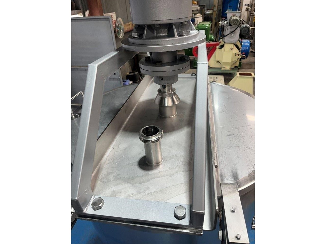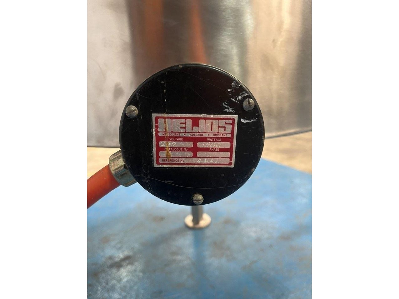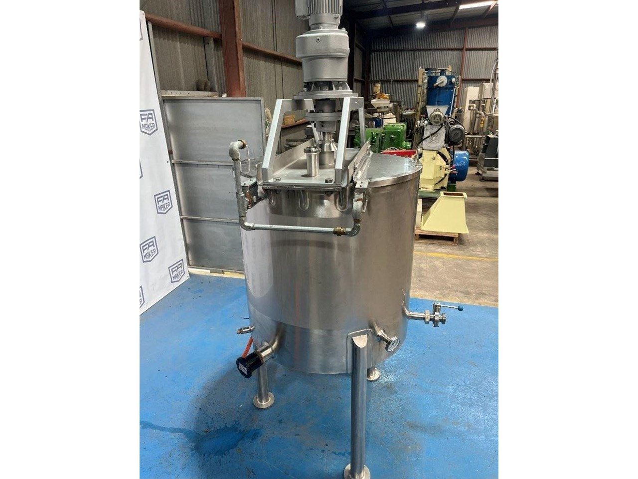 Jacketed mixing tank (stainless steel) with electric heating. 400 Litre volume. 3 Phase, 0.75kW, 415V gearmotor. Stainless steel mixing paddle. Speed: 17 RPM Flat bottom to a 1.5 inch outlet with a ss butterfly valve. 2 x hinged lids fitted with saftey switches. 2 inch top fill port. 2 x 1kW, 240V Helios heating elements. 1 x Teltru Thermometer. Overall height 2450mm. Mixer runs very well and heating elements work. (Temp controller required) Ex chocolate manufacturer.