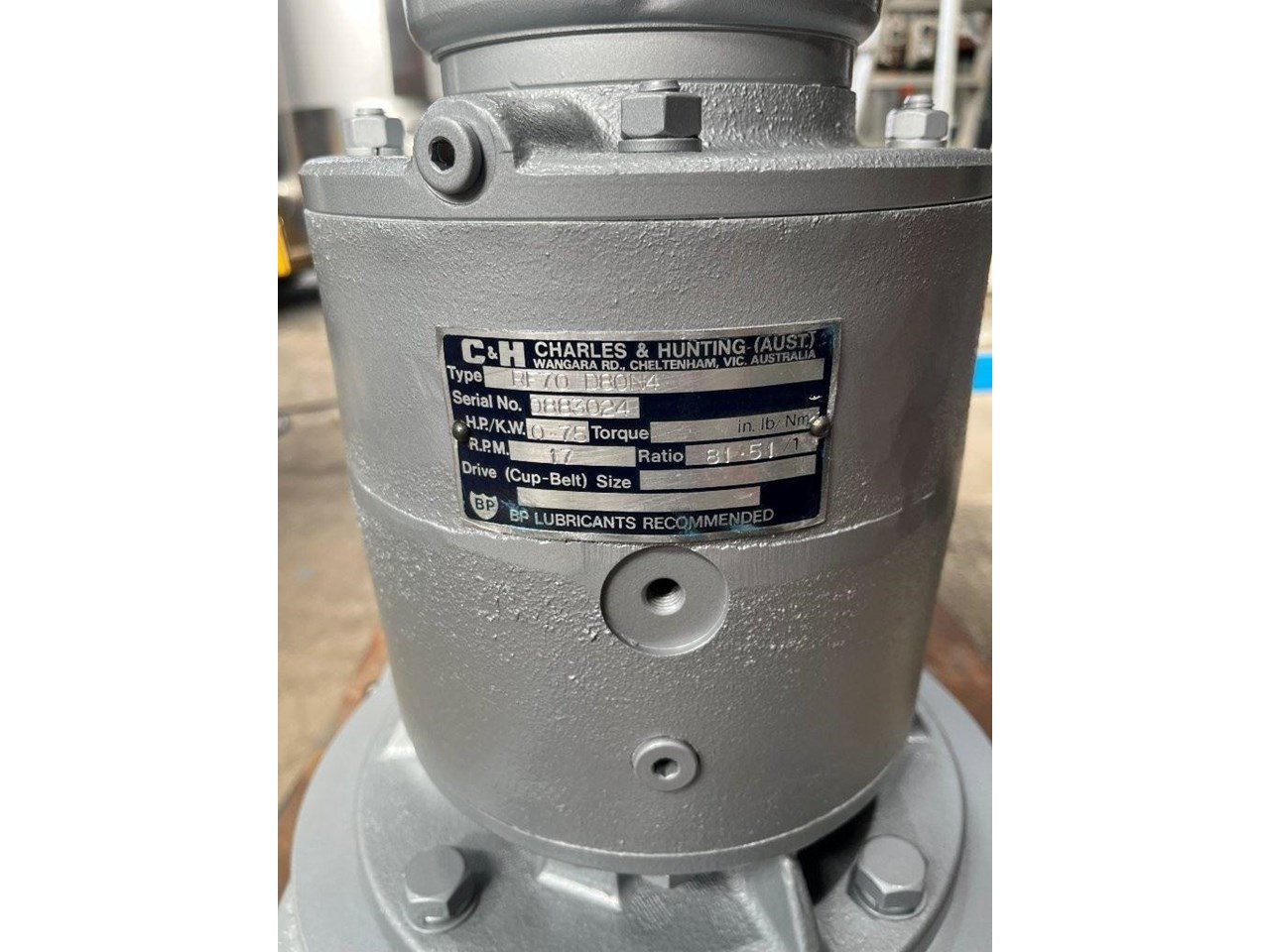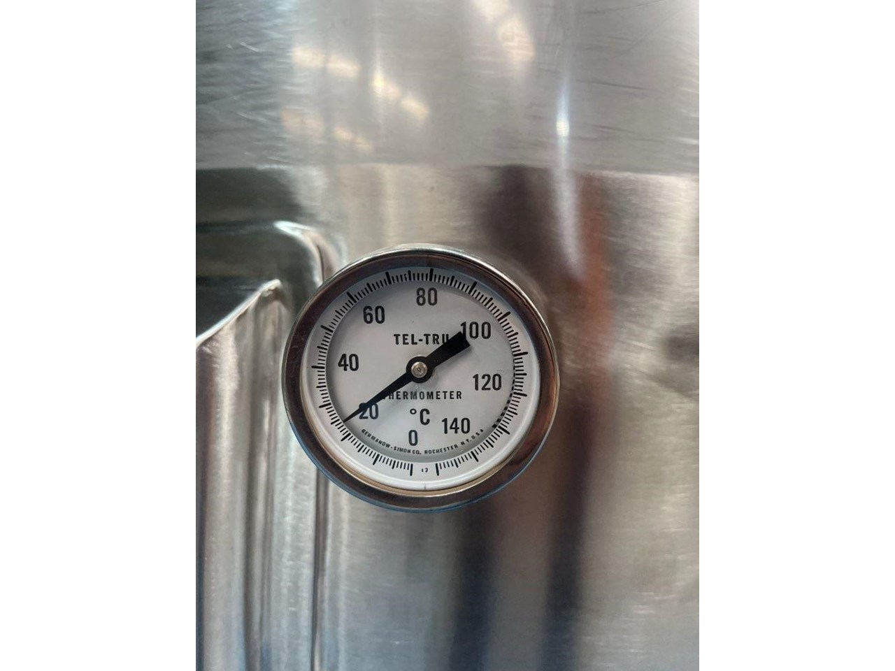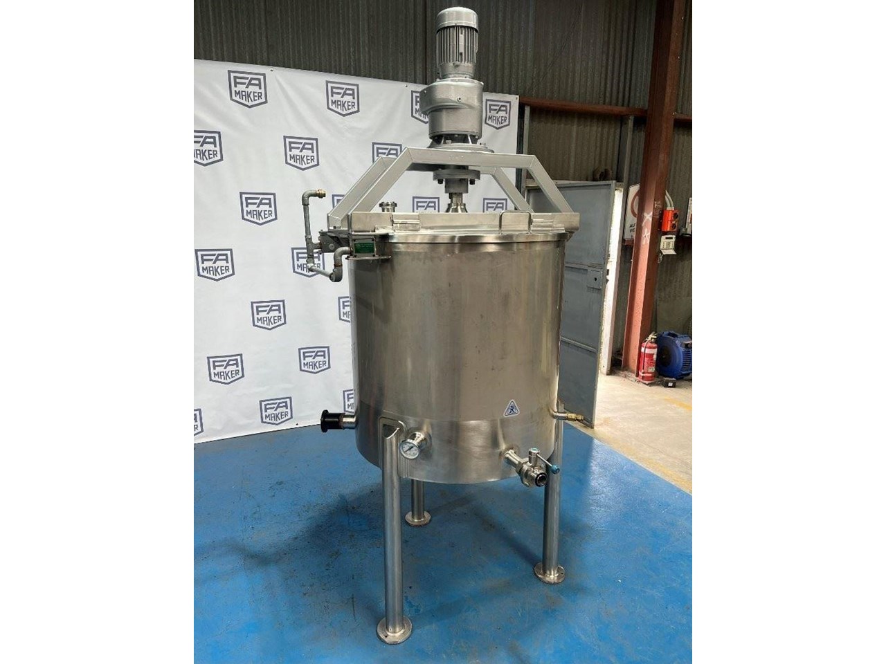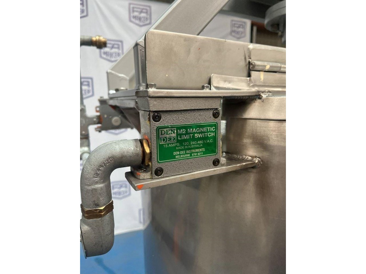 Jacketed mixing tank (stainless steel) with electric heating. 400 Litre volume. 3 Phase, 0.75kW, 415V gearmotor. Stainless steel mixing paddle. Speed: 17 RPM Flat bottom to a 1.5 inch outlet with a ss butterfly valve. 2 x hinged lids fitted with saftey switches. 2 inch top fill port. 2 x 1kW, 240V Helios heating elements. 1 x Teltru Thermometer. Overall height 2450mm. Mixer runs very well and heating elements work. (Temp controller required) Ex chocolate manufacturer.