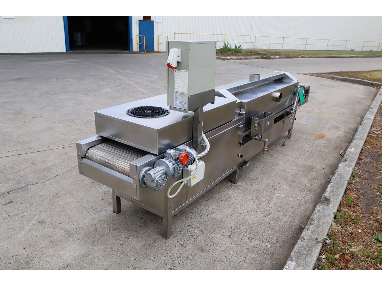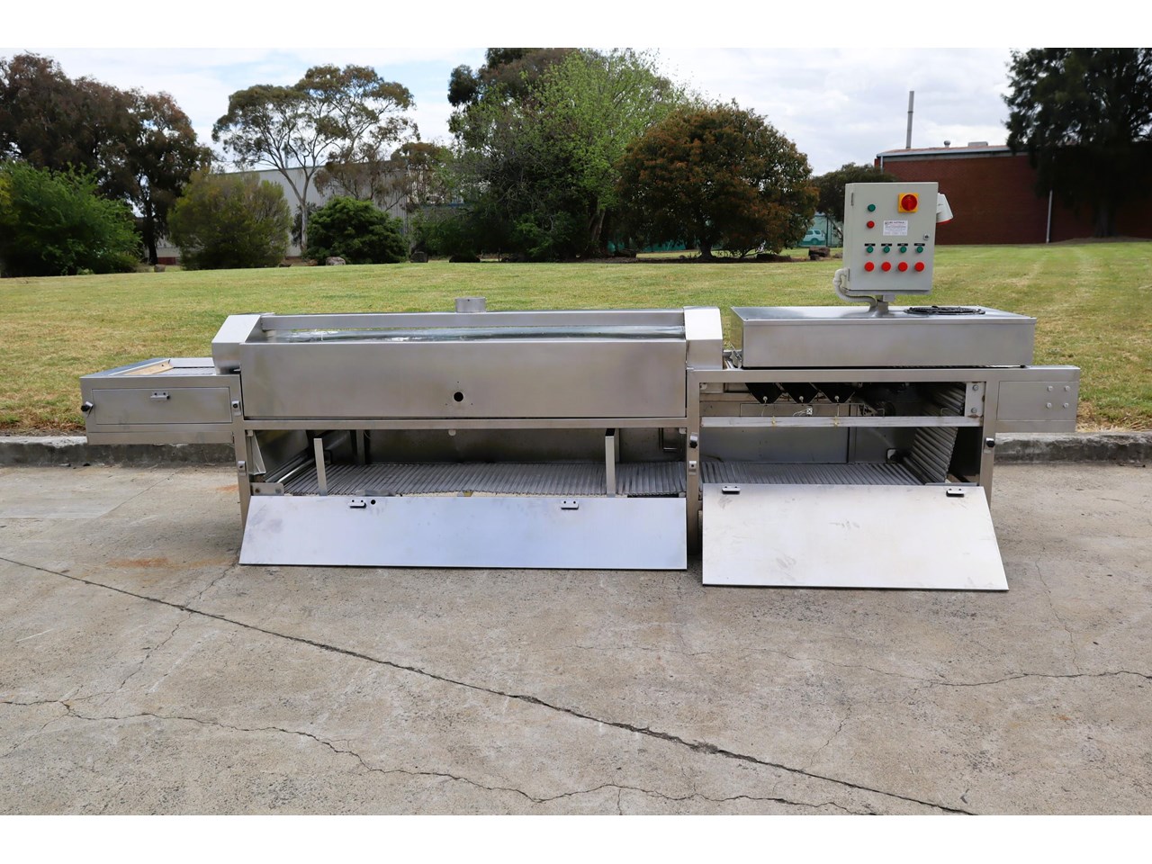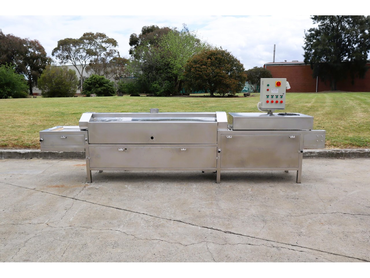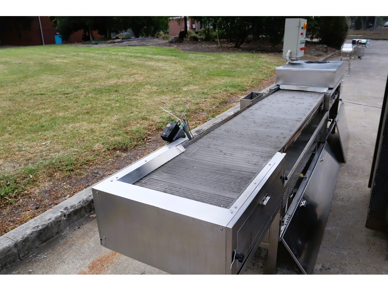 Stainless steel steam pasteuriser for pasta in excellent condition. Provides thermal pasteurisation of fresh pasta products using steam. The machine features a mesh conveyor belt running through an enclosed tunnel, where water in a shallow reservoir is heated by a gas fired system. This was supplied in Australia by MEC Australia.