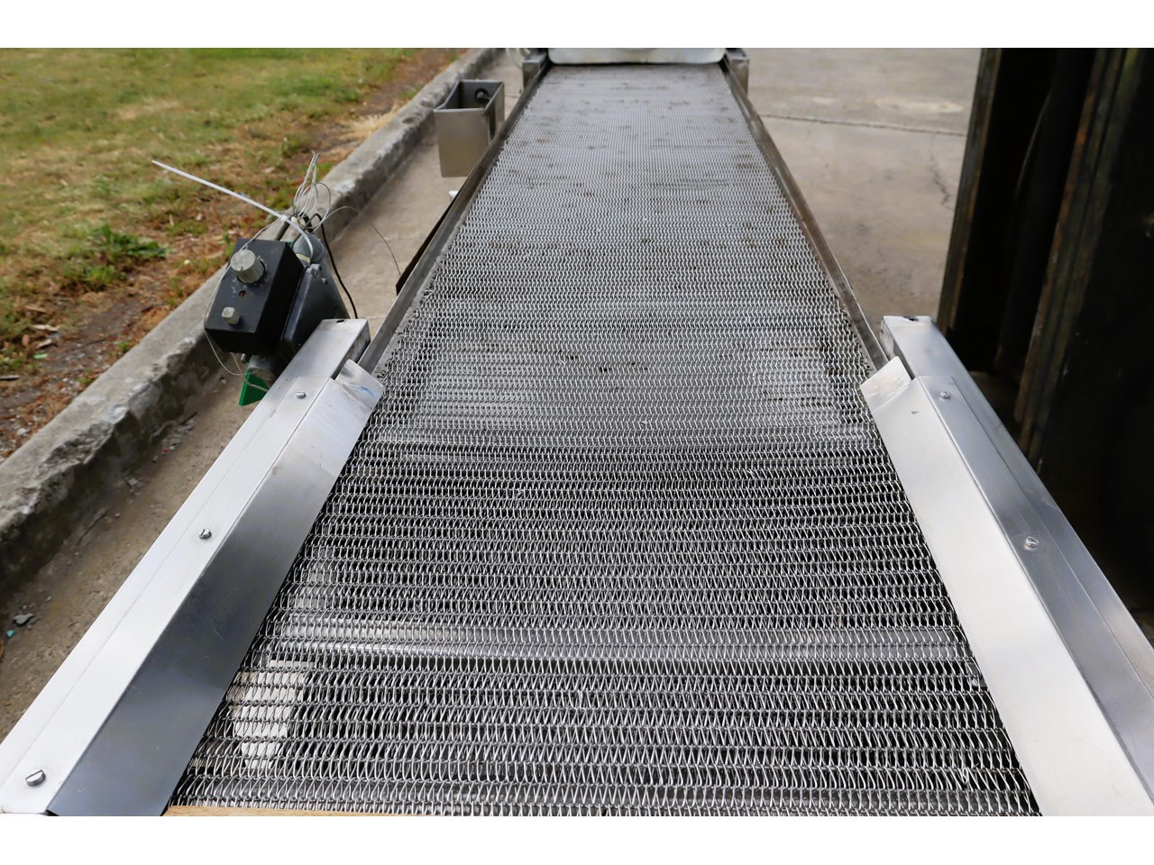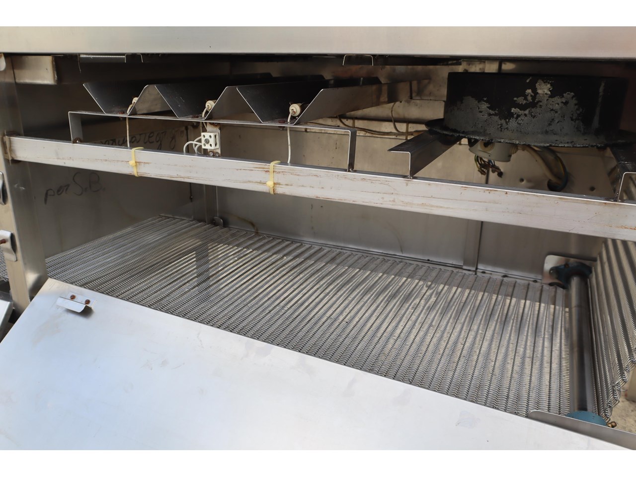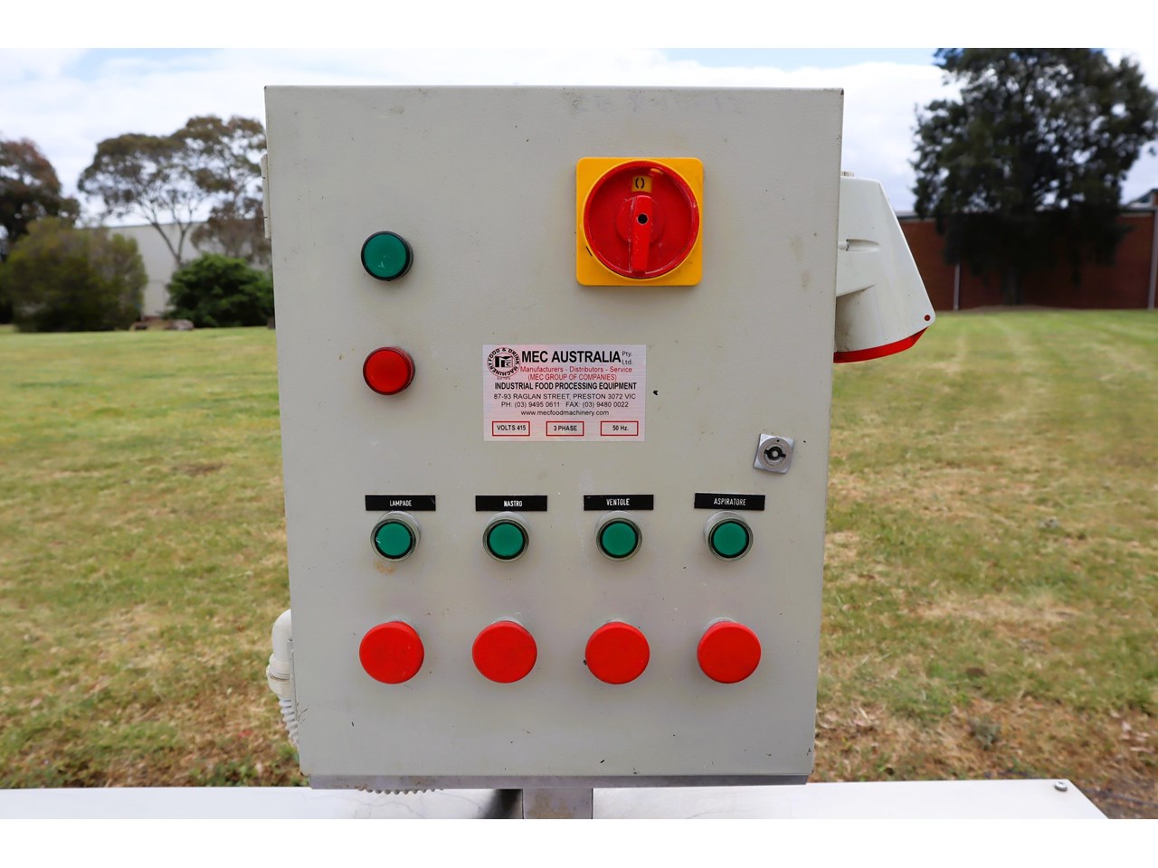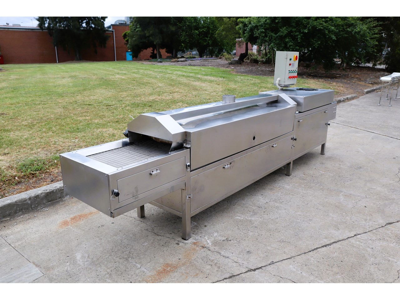 Stainless steel steam pasteuriser for pasta in excellent condition. Provides thermal pasteurisation of fresh pasta products using steam. The machine features a mesh conveyor belt running through an enclosed tunnel, where water in a shallow reservoir is heated by a gas fired system. This was supplied in Australia by MEC Australia.