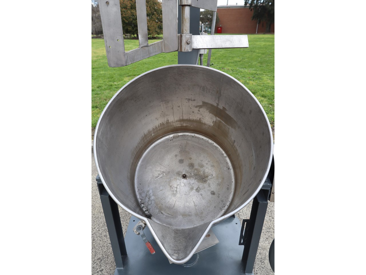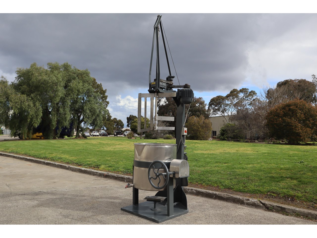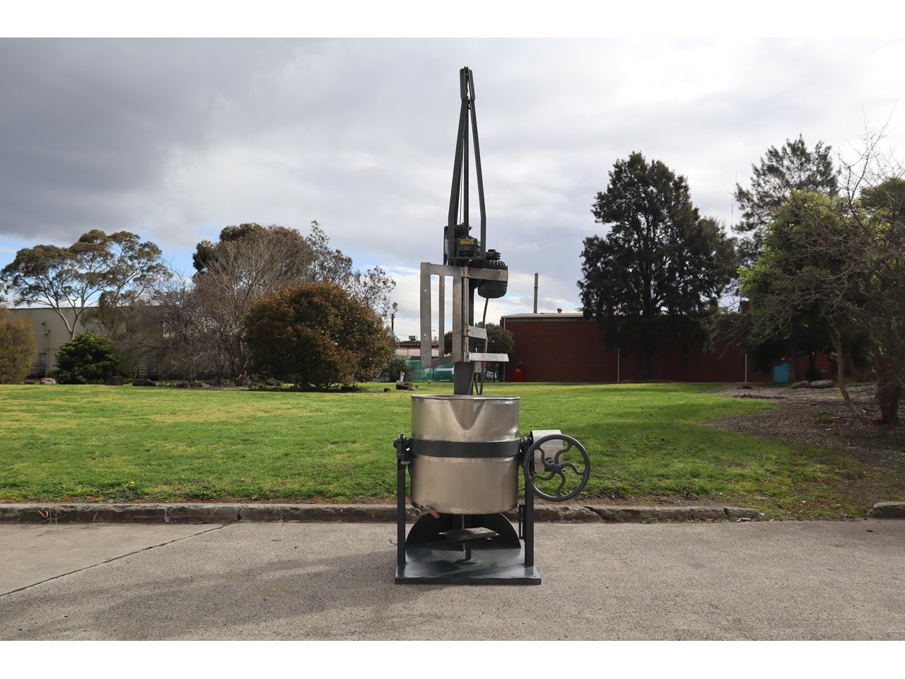 This industrial stainless steel mixing tank features a manual crank system that allows for easy tilting, making simple and safe to empty or transfer contents. Another manual crank is fitting for raising and lowering the mixing blade, allowing for flexibility and control during operation.